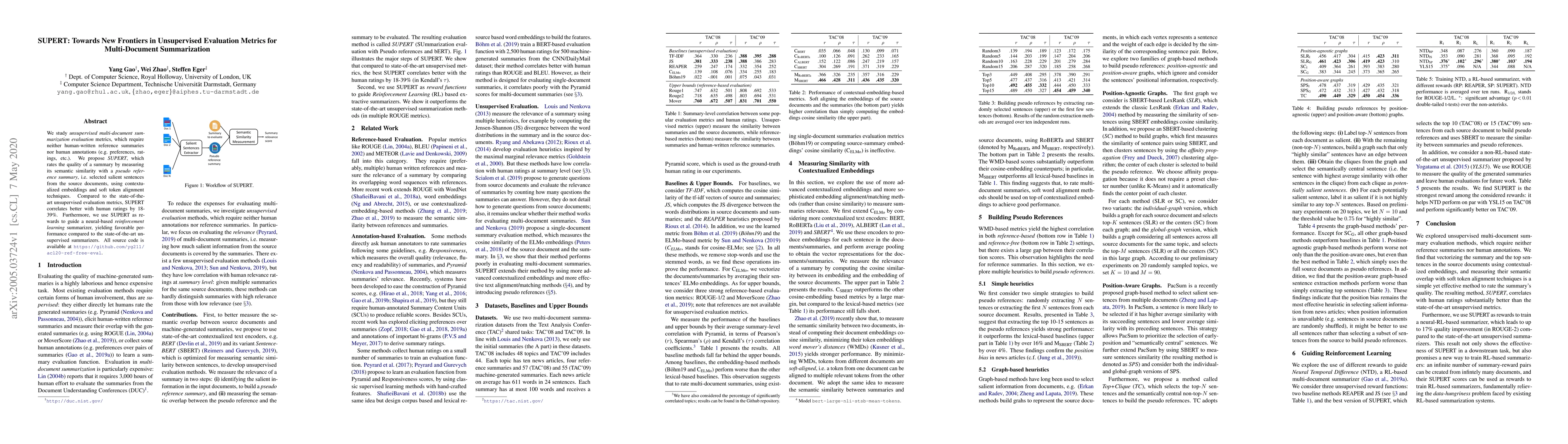 A new unsupervised evaluation metric called SUPERT is proposed to measure summary quality, which correlates better with human ratings than existing metrics. It improves the performance of neural-based reinforcement learning summarizers.