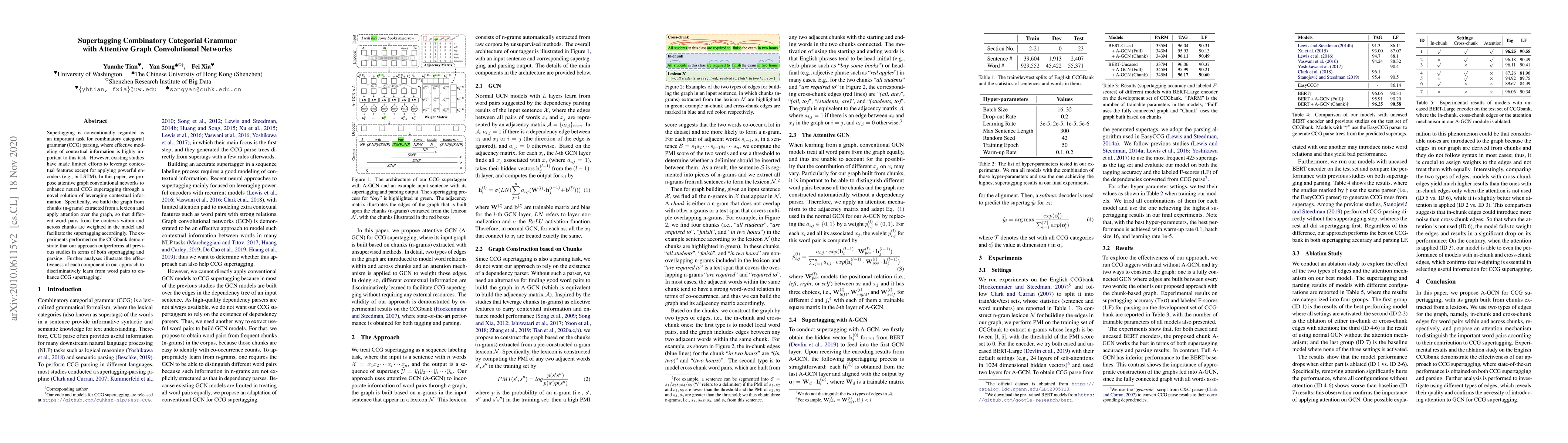 This paper proposes an attentive graph convolutional network to improve combinatory categorial grammar (CCG) supertagging by leveraging contextual information from word pairs within and across chunks. Experimental results on CCGbank show superior performance over previous methods.