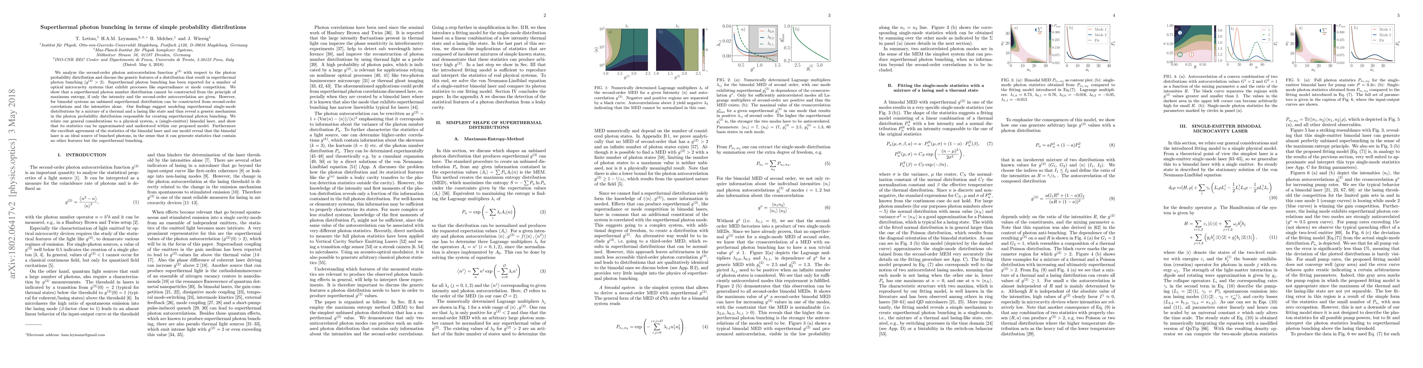This paper investigates the second-order photon autocorrelation function $g^{(2)}$ to identify the probability distributions leading to superthermal photon bunching ($g^{(2)}>2$). It concludes that superthermal distributions cannot be derived from maximum entropy principles given only intensity and second-order autocorrelation, but bimodal systems can generate unbiased superthermal distributions. The study proposes a model combining thermal and lasing states for superthermal single-mode distributions, validated by a bimodal laser system.