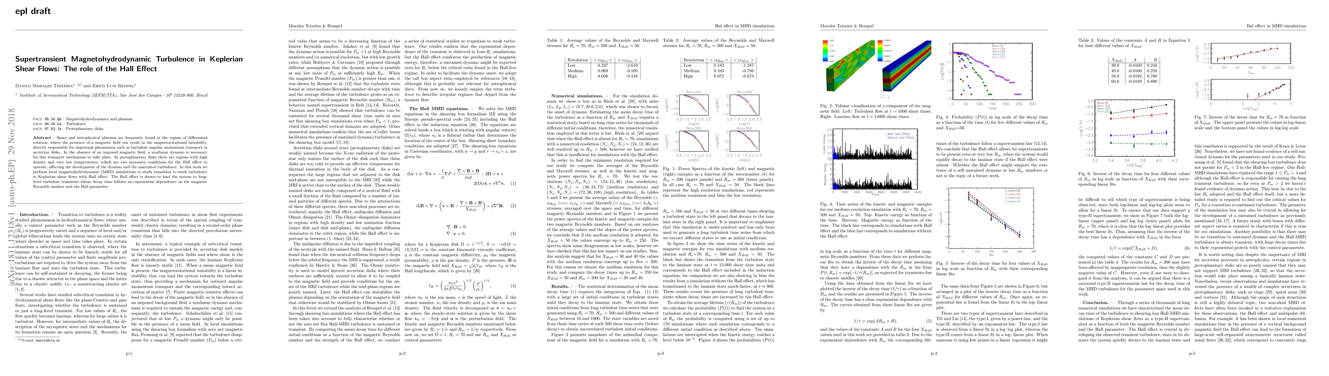 This paper investigates the role of the Hall effect in the development of supertransient magnetohydrodynamic turbulence in Keplerian shear flows, demonstrating that it leads to long-lived turbulent transients, with decay times dependent on the magnetic Reynolds number and the Hall parameter. Local MHD simulations reveal the influence of the Hall effect on the nonlinear dynamo and turbulence in protoplanetary disks.