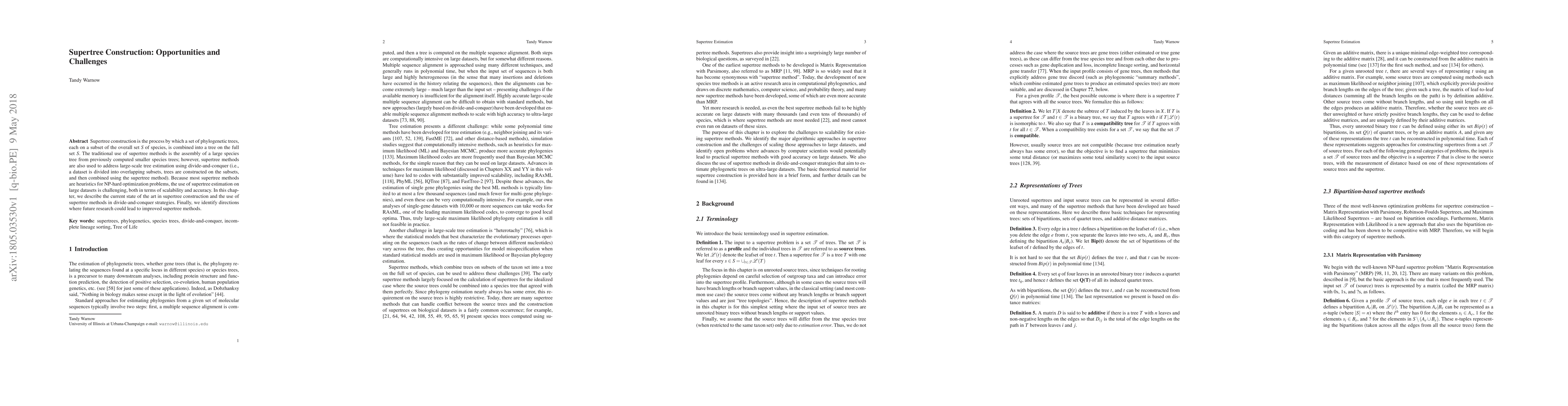 This paper reviews the current state of supertree construction, focusing on combining smaller phylogenetic trees into a comprehensive species tree, and discusses the challenges of scalability and accuracy in large datasets. It also explores the divide-and-conquer approach for large-scale tree estimation and suggests future research directions for improved supertree methods.
