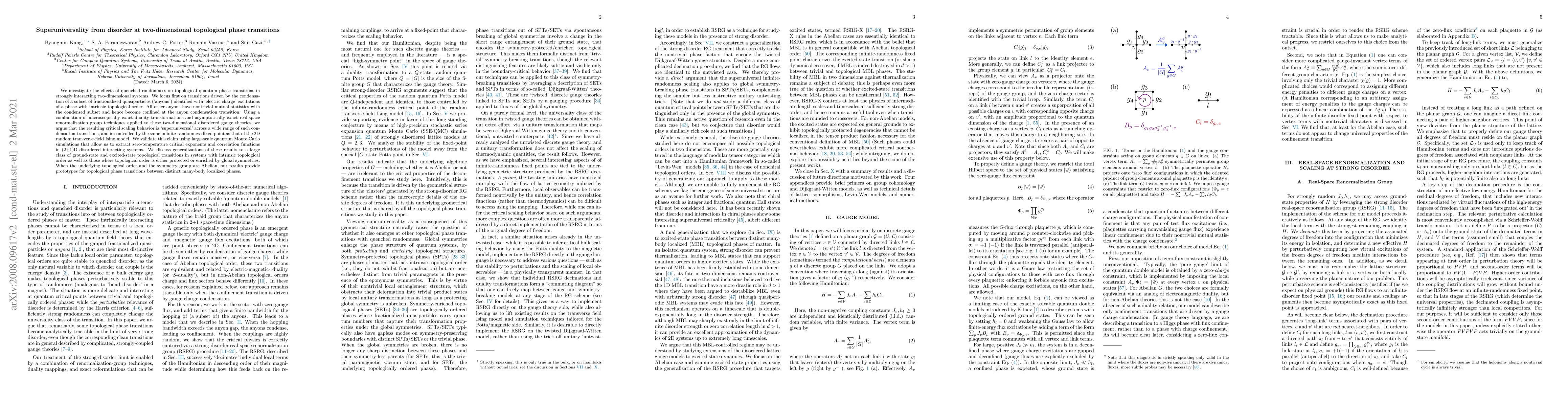 This paper explores how quenched randomness influences topological quantum phase transitions in two-dimensional systems, demonstrating that the critical behavior is "superuniversal" across a wide range of transitions, governed by an infinite-randomness fixed point. The findings are validated through quantum Monte Carlo simulations and have implications for various topological transitions in systems with intrinsic order.