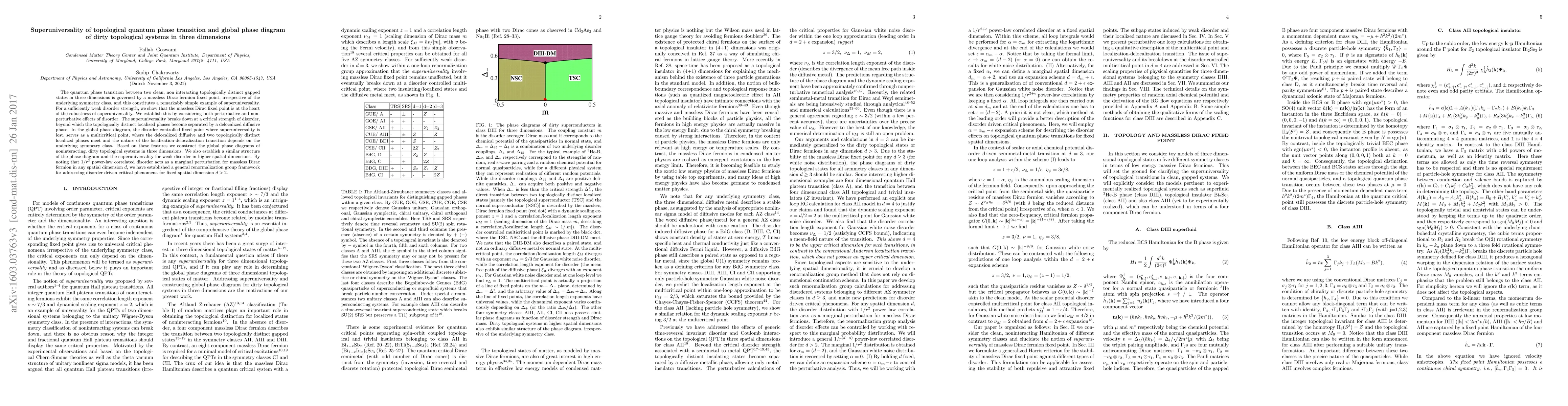 This paper demonstrates the superuniversality of quantum phase transitions in three-dimensional topological systems, showing that disorder impacts the robustness of this transition. It establishes a global phase diagram for dirty topological systems, identifying a multicritical point where superuniversality breaks down, and discusses its implications for higher spatial dimensions.