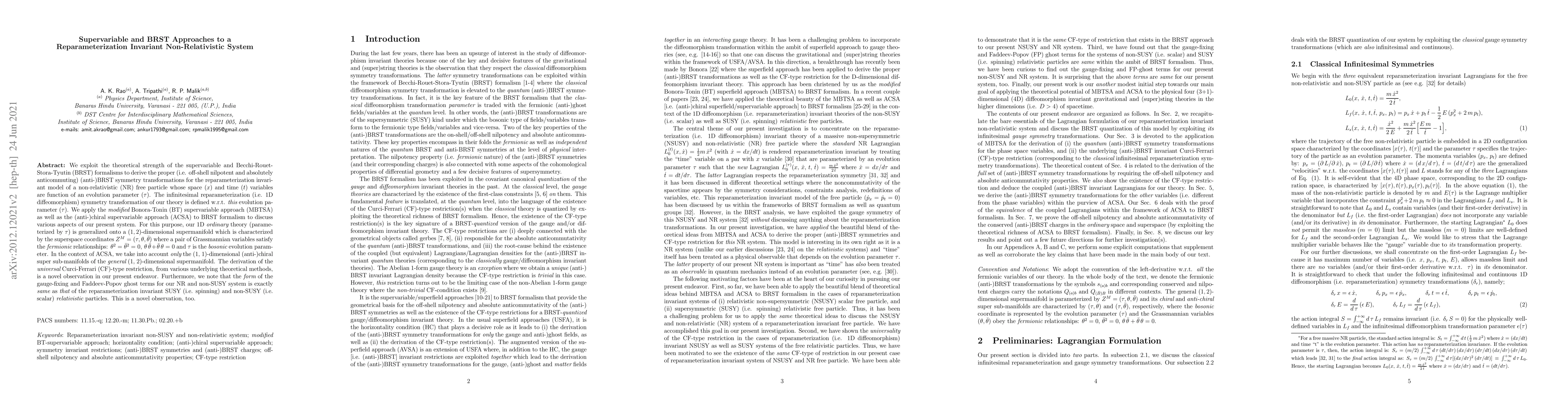 We exploit the theoretical strength of the supervariable and Becchi-Rouet-Stora-Tyutin (BRST) formalisms to derive the proper (i.e. off-shell nilpotent and absolutely anticommuting) (anti-)BRST symmetry transformations for the reparameterization invariant model of a non-relativistic (NR) free particle whose space $(x)$ and time $(t)$ variables are function of an evolution parameter $(\tau)$. The infinitesimal reparameterization (i.e. 1D diffeomorphism) symmetry transformation of our theory is defined w.r.t. this evolution parameter $(\tau)$. We apply the modified Bonora-Tonin (BT) supervariable approach (MBTSA) as well as the (anti-)chiral supervariable approach (ACSA) to BRST formalism to discuss various aspects of our present system. For this purpose, our 1D ordinary theory (parameterized by $\tau$) is generalized onto a $(1, 2)$-dimensional supermanifold which is characterized by the superspace coordinates $Z^M = (\tau, \theta, \bar\theta)$ where a pair of Grassmannian variables satisfy the fermionic relationships: $\theta^2 = {\bar\theta}^2 = 0, \, \theta\,\bar\theta + \bar\theta\,\theta = 0$ and $\tau$ is the bosonic evolution parameter. In the context of ACSA, we take into account only the (1, 1)-dimensional (anti-)chiral super sub-manifolds of the general (1, 2)-dimensional supermanifold. The derivation of the universal Curci-Ferrari (CF)-type restriction, from various underlying theoretical methods, is a novel observation in our present endeavor. Furthermore, we note that the form of the gauge-fixing and Faddeev-Popov ghost terms for our NR and non-SUSY system is exactly same as that of the reparameterization invariant SUSY (i.e. spinning) and non-SUSY (i.e. scalar) relativistic particles. This is a novel observation, too.