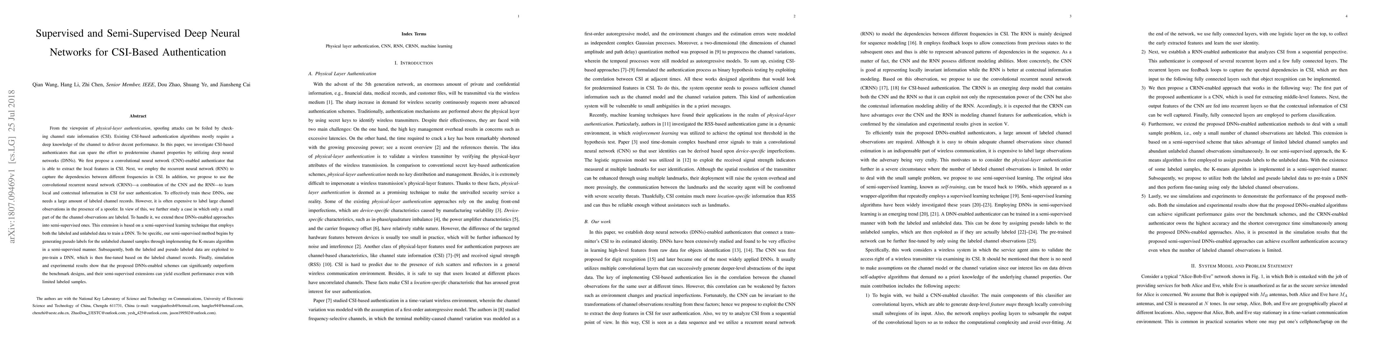 This paper proposes deep neural network-based methods for CSI-based authentication, utilizing CNNs and RNNs to extract and capture features in channel state information. To address the scarcity of labeled data, it introduces semi-supervised learning techniques that leverage both labeled and unlabeled channel observations for training.