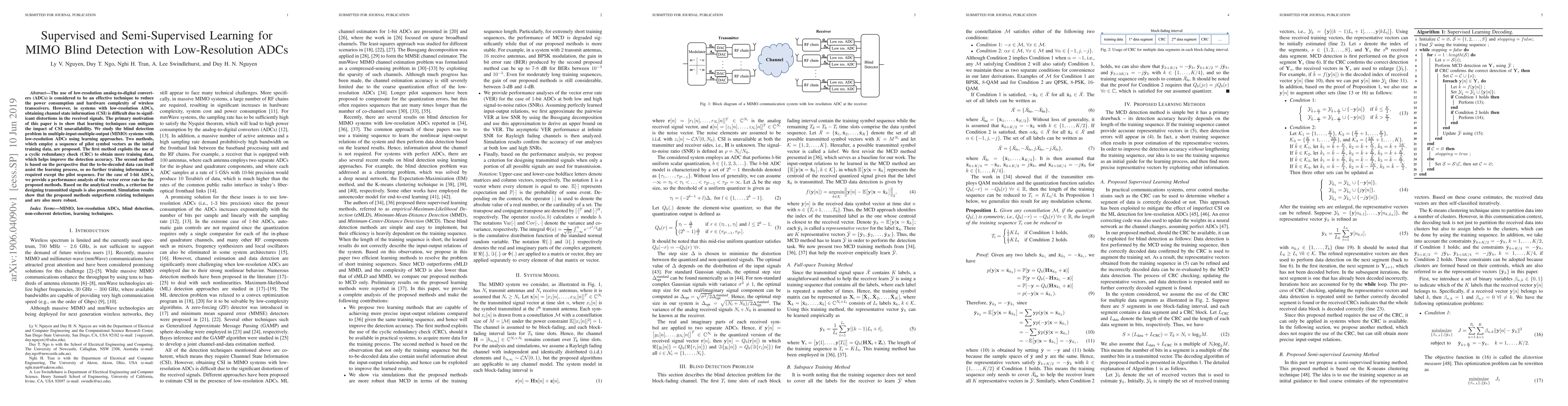 This paper explores supervised and semi-supervised learning techniques to address the blind detection problem in MIMO systems with low-resolution ADCs, aiming to mitigate the impact of channel state information unavailability. The proposed methods utilize pilot symbols and innovative training strategies to enhance detection accuracy, demonstrating superior performance over existing techniques.
