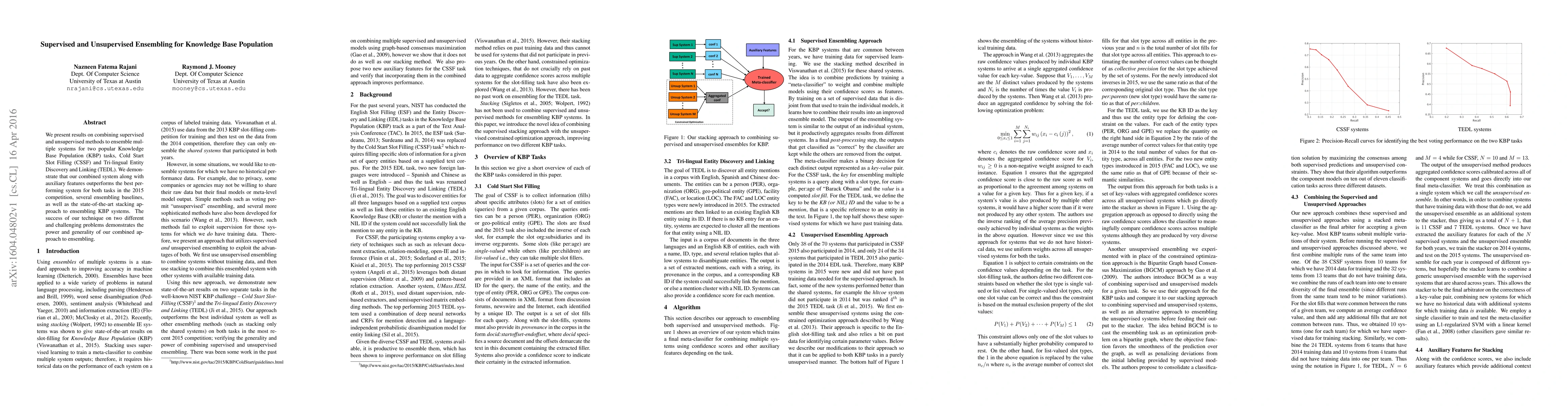 This paper combines supervised and unsupervised ensembling methods to improve performance on two Knowledge Base Population tasks: Cold Start Slot Filling and Tri-lingual Entity Discovery and Linking. The proposed hybrid system, enhanced with auxiliary features, outperforms existing systems and state-of-the-art ensembling techniques, showcasing the effectiveness of the approach.