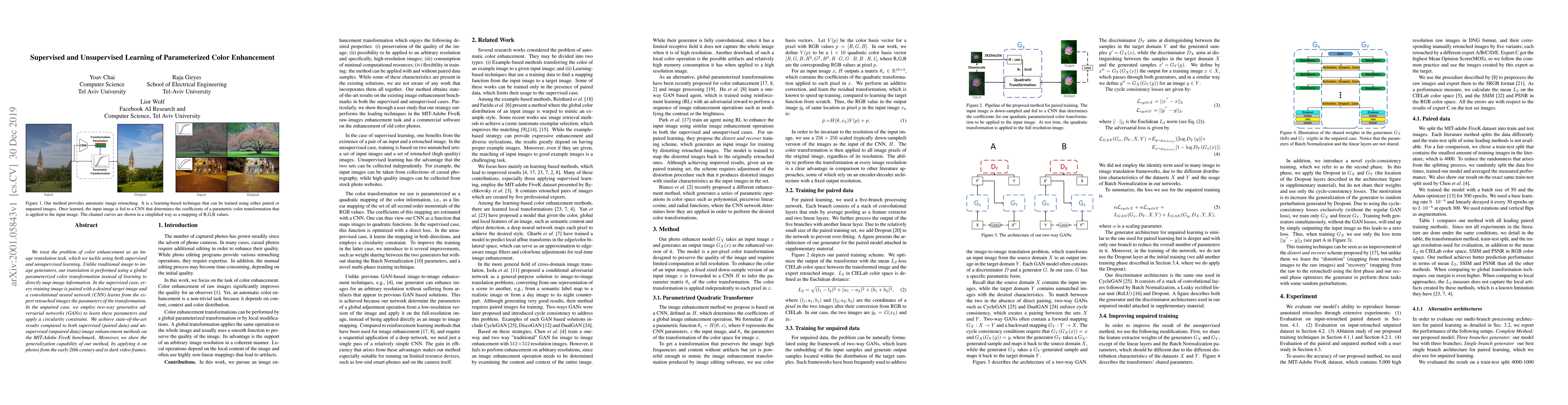 We treat the problem of color enhancement as an image translation task, which we tackle using both supervised and unsupervised learning. Unlike traditional image to image generators, our translation is performed using a global parameterized color transformation instead of learning to directly map image information. In the supervised case, every training image is paired with a desired target image and a convolutional neural network (CNN) learns from the expert retouched images the parameters of the transformation. In the unpaired case, we employ two-way generative adversarial networks (GANs) to learn these parameters and apply a circularity constraint. We achieve state-of-the-art results compared to both supervised (paired data) and unsupervised (unpaired data) image enhancement methods on the MIT-Adobe FiveK benchmark. Moreover, we show the generalization capability of our method, by applying it on photos from the early 20th century and to dark video frames.
