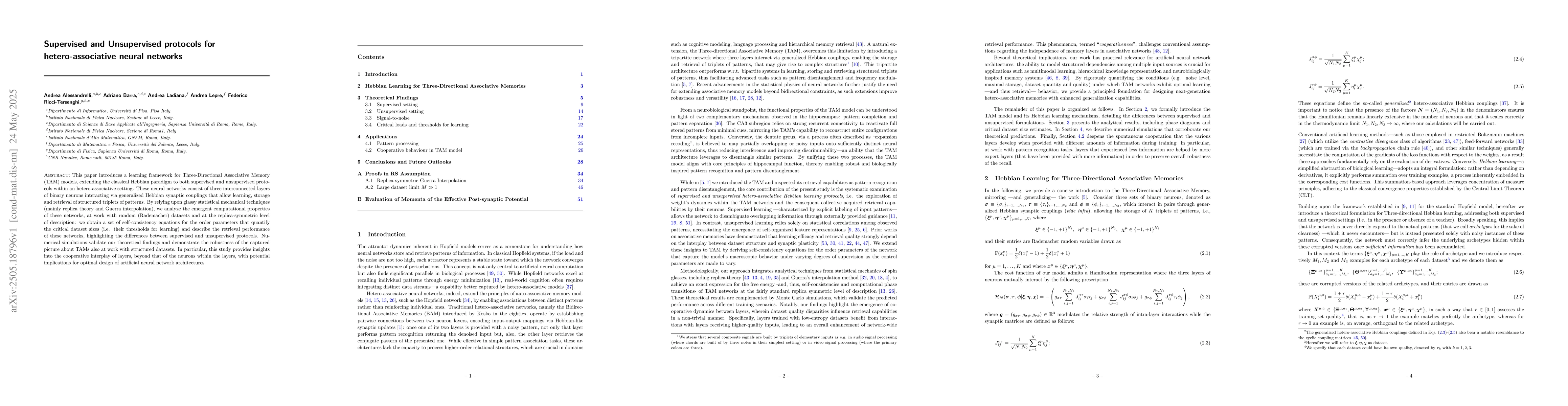 This work extends the classical Hebbian paradigm to supervised and unsupervised protocols in a hetero-associative setting, providing a detailed analysis of TAM networks' computational properties using glassy statistical mechanics.