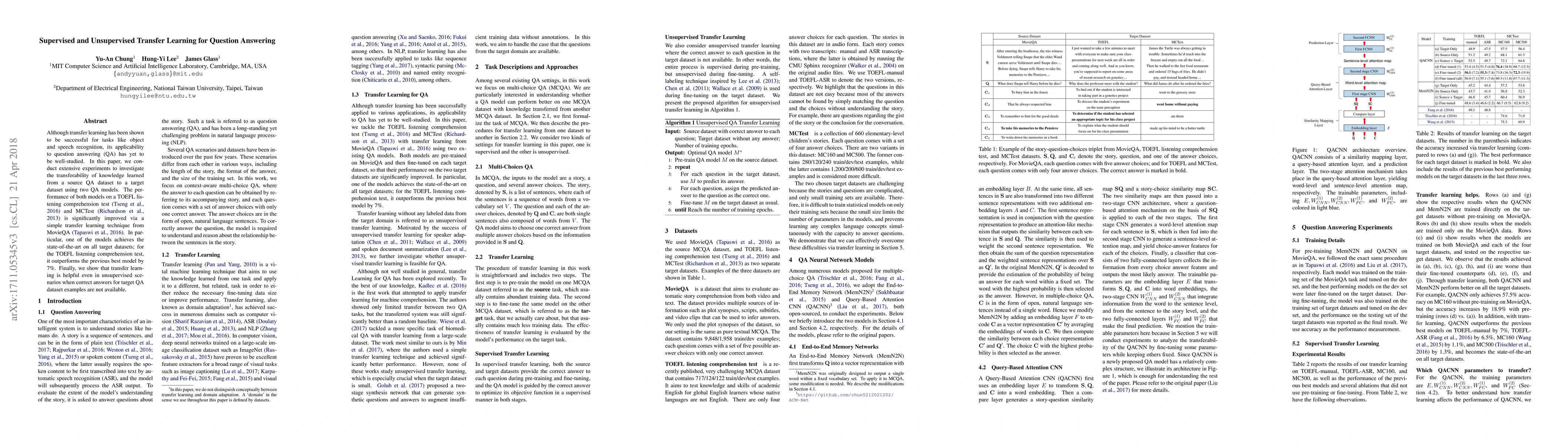 This paper investigates transfer learning for question answering (QA), showing significant performance improvements on TOEFL and MCTest using knowledge transferred from MovieQA. One model achieves state-of-the-art results and outperforms previous models by 7% on TOEFL, demonstrating transfer learning's effectiveness even in unsupervised settings.