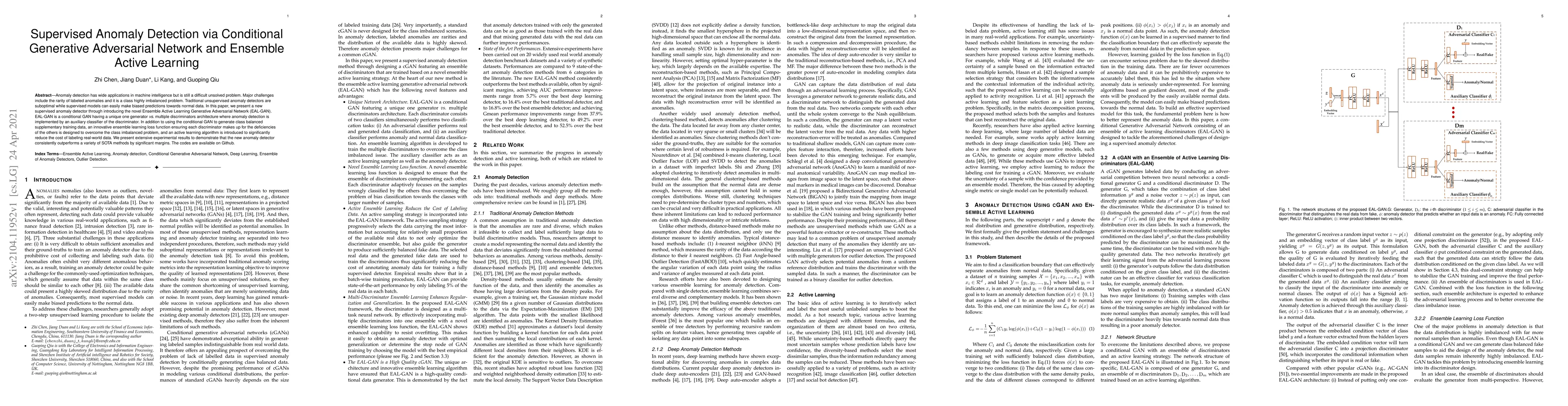 This paper introduces EAL-GAN, a supervised anomaly detection method combining a conditional Generative Adversarial Network with ensemble active learning to address class imbalance and data scarcity. The approach uses multiple discriminators to enhance detection accuracy and an active learning algorithm to minimize labeling costs.