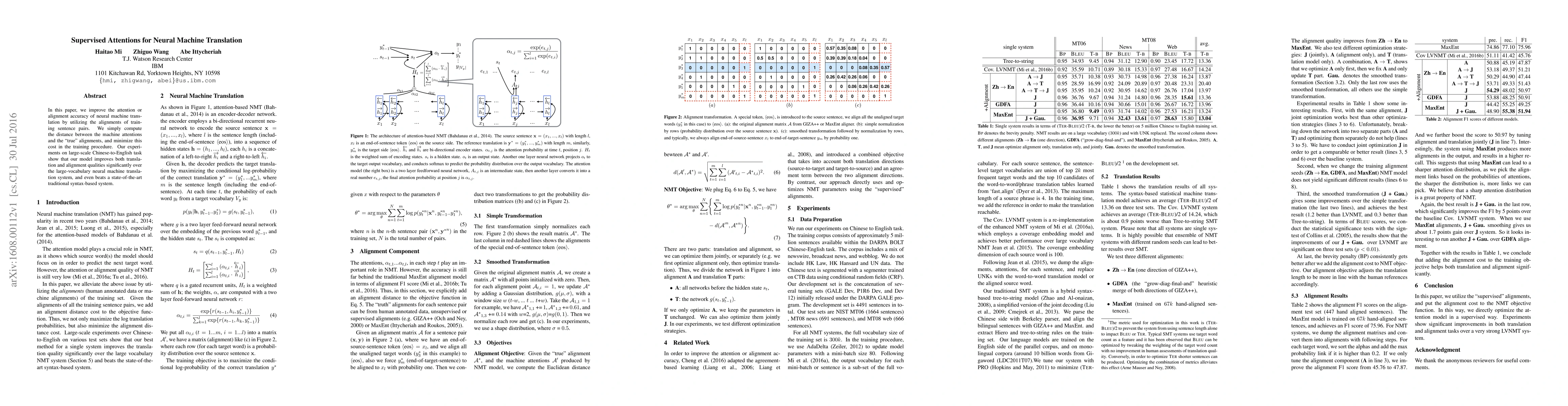 This paper enhances neural machine translation by aligning machine attentions with true sentence pair alignments during training, significantly improving both translation and alignment accuracy, outperforming even a state-of-the-art syntax-based system in Chinese-to-English translation.