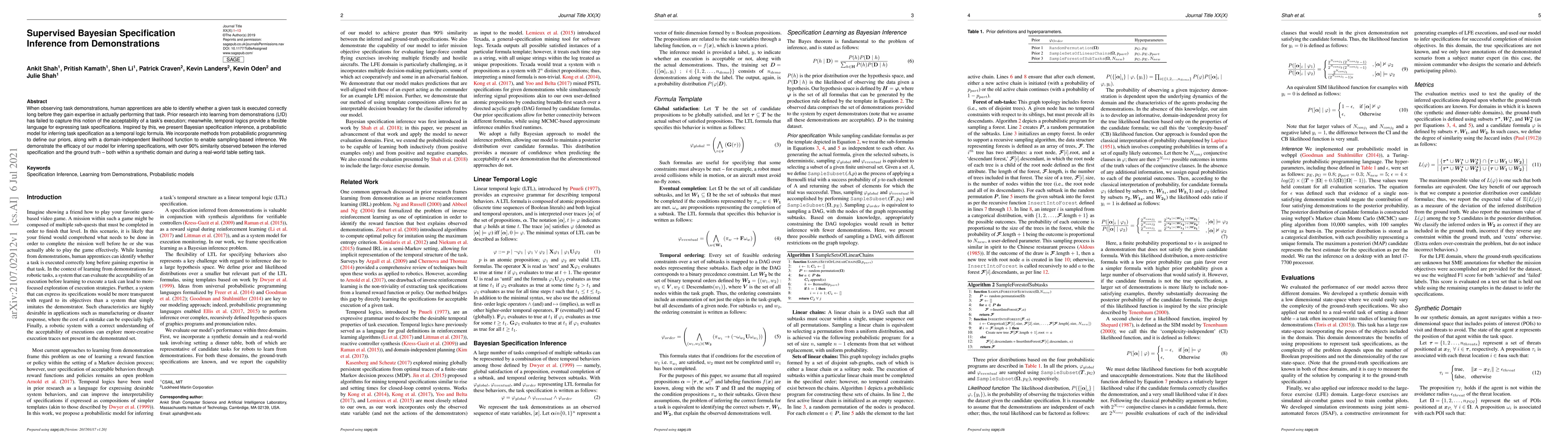 This paper introduces Bayesian specification inference, a probabilistic model that uses temporal logic to infer task specifications from demonstrations, achieving over 90% similarity to ground truth in both synthetic and real-world settings. The model leverages probabilistic programming and a domain-independent likelihood function for effective inference.