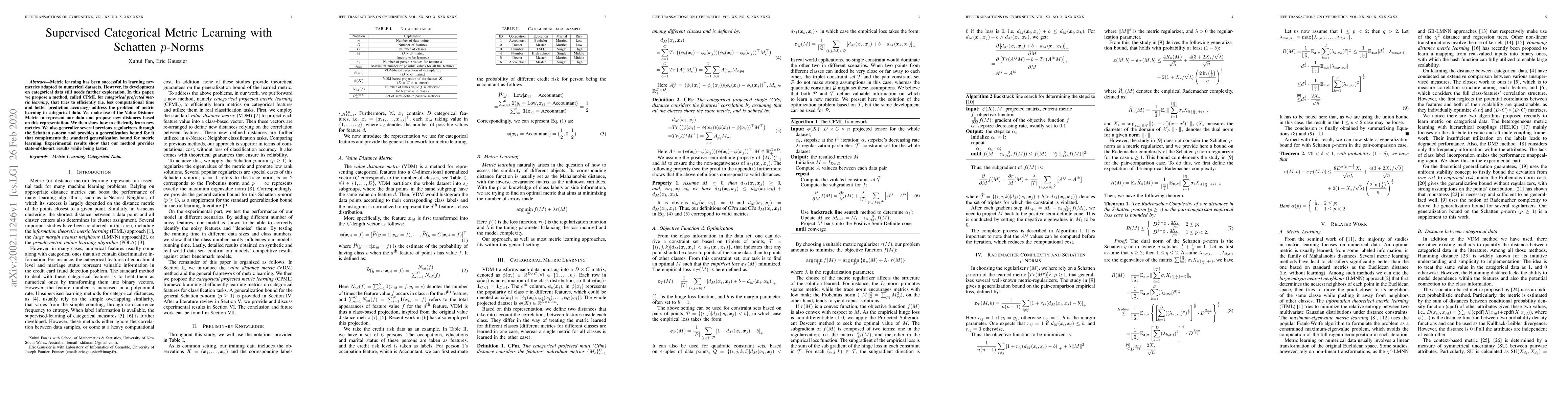 This paper introduces CPML, a method for efficient metric learning in categorical data using Value Distance Metric and Schatten p-norms regularizers. Experiments demonstrate improved prediction accuracy and reduced computational time compared to previous approaches.