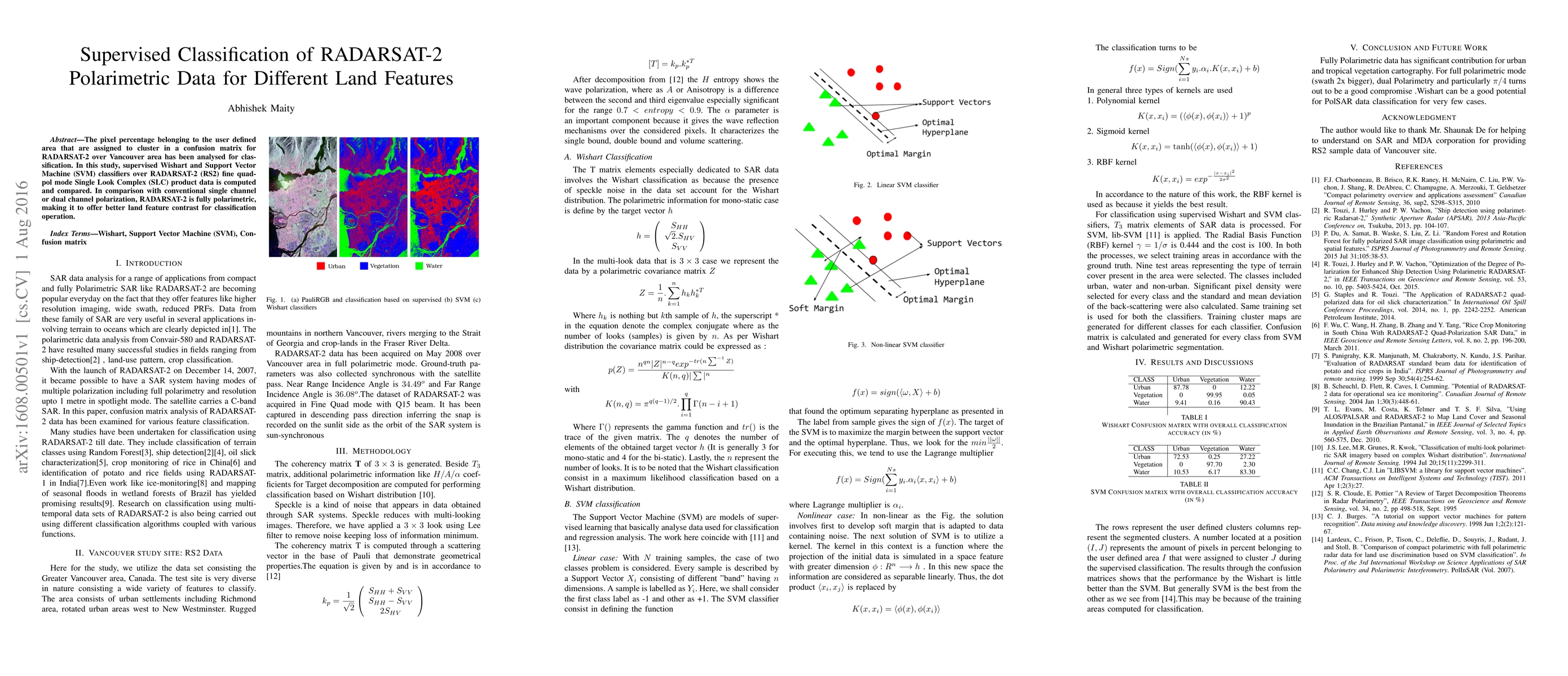 The pixel percentage belonging to the user defined area that are assigned to cluster in a confusion matrix for RADARSAT-2 over Vancouver area has been analysed for classification. In this study, supervised Wishart and Support Vector Machine (SVM) classifiers over RADARSAT-2 (RS2) fine quadpol mode Single Look Complex (SLC) product data is computed and compared. In comparison with conventional single channel or dual channel polarization, RADARSAT-2 is fully polarimetric, making it to offer better land feature contrast for classification operation.