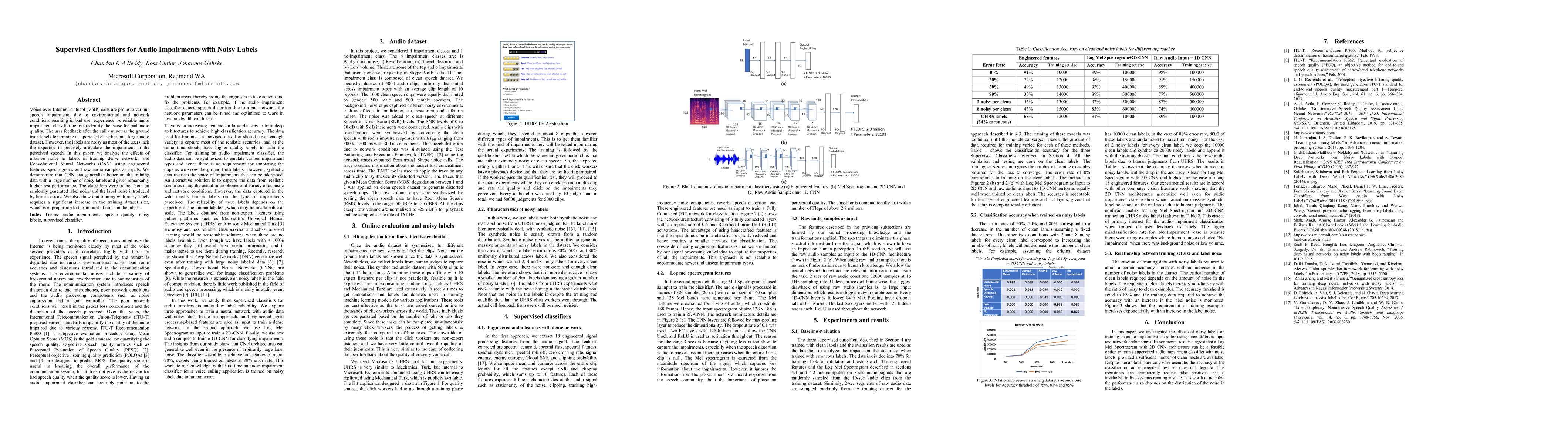 This paper investigates the impact of noisy labels on supervised classifiers for identifying audio impairments in VoIP calls, demonstrating that Convolutional Neural Networks (CNNs) outperform dense networks in handling such noise, requiring larger datasets to achieve high test performance.