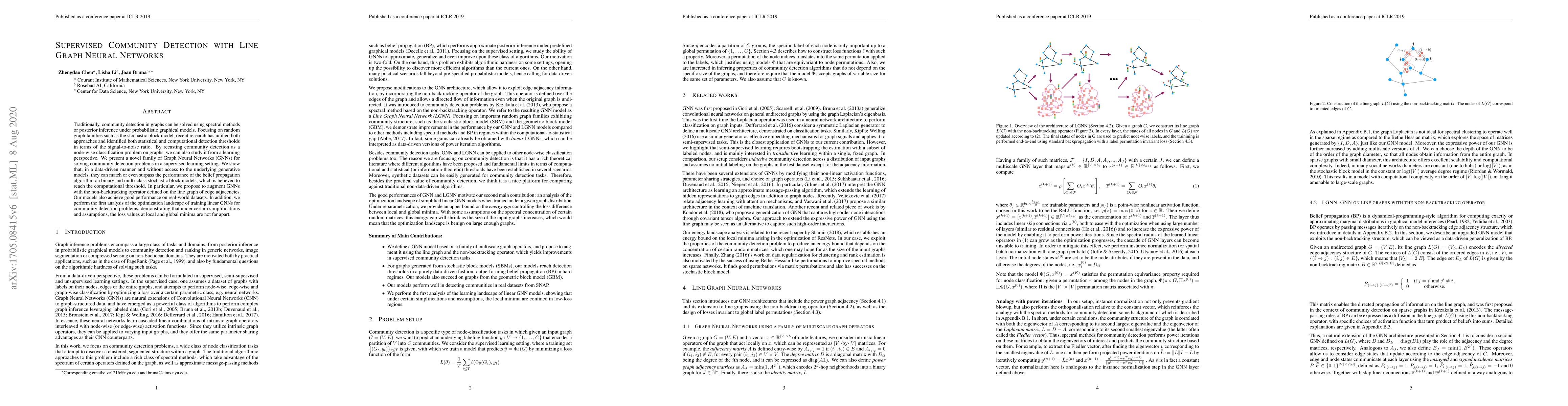 Traditionally, community detection in graphs can be solved using spectral methods or posterior inference under probabilistic graphical models. Focusing on random graph families such as the stochastic block model, recent research has unified both approaches and identified both statistical and computational detection thresholds in terms of the signal-to-noise ratio. By recasting community detection as a node-wise classification problem on graphs, we can also study it from a learning perspective. We present a novel family of Graph Neural Networks (GNNs) for solving community detection problems in a supervised learning setting. We show that, in a data-driven manner and without access to the underlying generative models, they can match or even surpass the performance of the belief propagation algorithm on binary and multi-class stochastic block models, which is believed to reach the computational threshold. In particular, we propose to augment GNNs with the non-backtracking operator defined on the line graph of edge adjacencies. Our models also achieve good performance on real-world datasets. In addition, we perform the first analysis of the optimization landscape of training linear GNNs for community detection problems, demonstrating that under certain simplifications and assumptions, the loss values at local and global minima are not far apart.