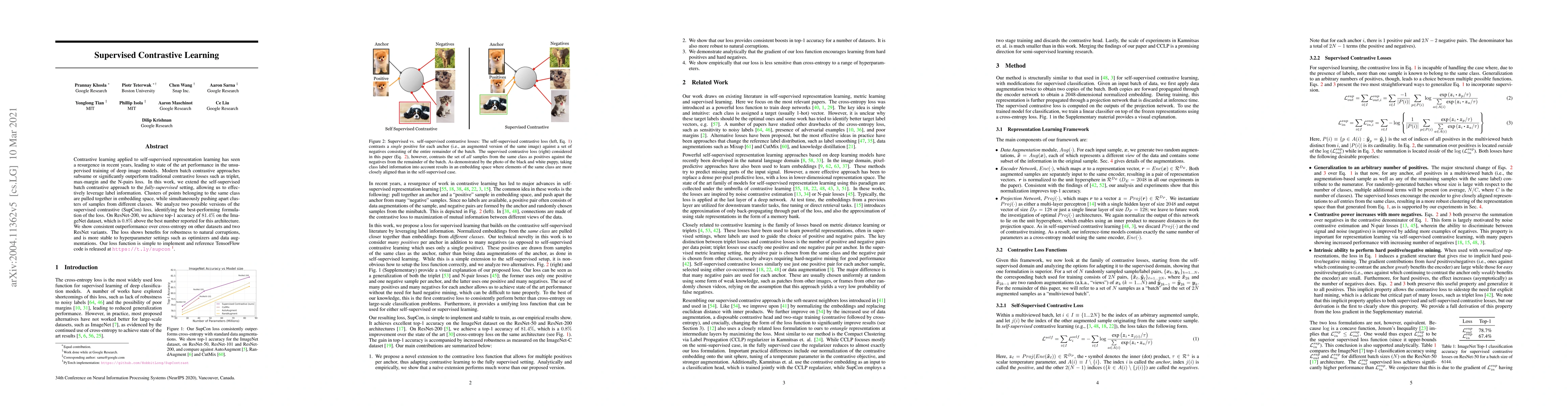 Contrastive learning applied to self-supervised representation learning has seen a resurgence in recent years, leading to state of the art performance in the unsupervised training of deep image models. Modern batch contrastive approaches subsume or significantly outperform traditional contrastive losses such as triplet, max-margin and the N-pairs loss. In this work, we extend the self-supervised batch contrastive approach to the fully-supervised setting, allowing us to effectively leverage label information. Clusters of points belonging to the same class are pulled together in embedding space, while simultaneously pushing apart clusters of samples from different classes. We analyze two possible versions of the supervised contrastive (SupCon) loss, identifying the best-performing formulation of the loss. On ResNet-200, we achieve top-1 accuracy of 81.4% on the ImageNet dataset, which is 0.8% above the best number reported for this architecture. We show consistent outperformance over cross-entropy on other datasets and two ResNet variants. The loss shows benefits for robustness to natural corruptions and is more stable to hyperparameter settings such as optimizers and data augmentations. Our loss function is simple to implement, and reference TensorFlow code is released at https://t.ly/supcon.