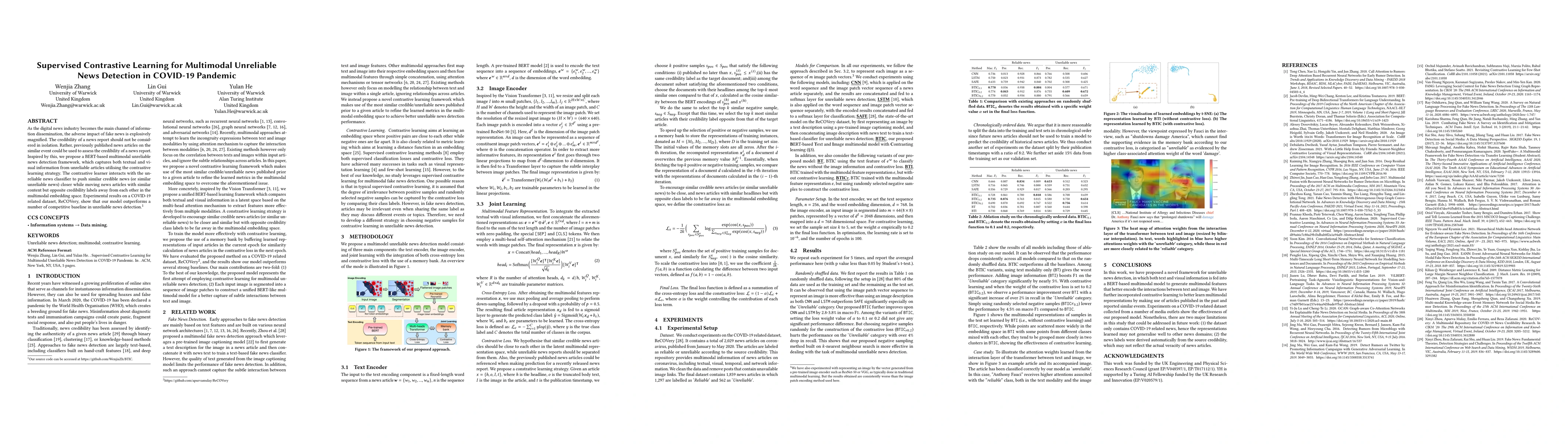 This paper proposes a BERT-based multimodal framework for detecting unreliable news during the COVID-19 pandemic, leveraging supervised contrastive learning to integrate textual and visual information. The model outperforms baselines in detecting unreliable news, as demonstrated on the ReCOVery dataset.