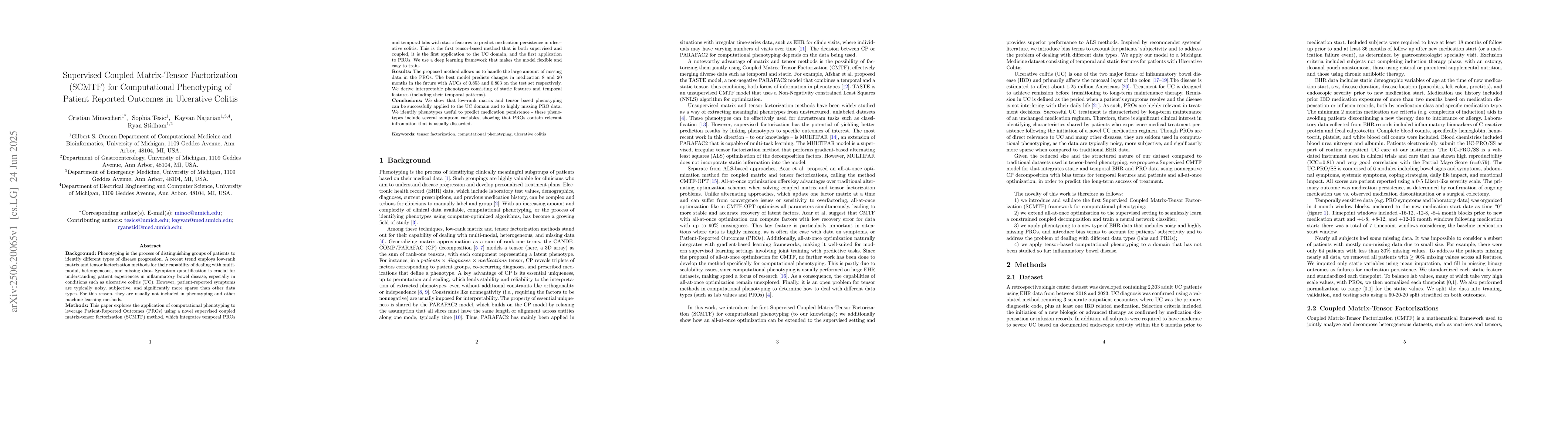Phenotyping is the process of distinguishing groups of patients to identify different types of disease progression. A recent trend employs low-rank matrix and tensor factorization methods for their capability of dealing with multi-modal, heterogeneous, and missing data. Symptom quantification is crucial for understanding patient experiences in inflammatory bowel disease, especially in conditions such as ulcerative colitis (UC). However, patient-reported symptoms are typically noisy, subjective, and significantly more sparse than other data types. For this reason, they are usually not included in phenotyping and other machine learning methods. This paper explores the application of computational phenotyping to leverage Patient-Reported Outcomes (PROs) using a novel supervised coupled matrix-tensor factorization (SCMTF) method, which integrates temporal PROs and temporal labs with static features to predict medication persistence in ulcerative colitis. This is the first tensor-based method that is both supervised and coupled, it is the first application to the UC domain, and the first application to PROs. We use a deep learning framework that makes the model flexible and easy to train. The proposed method allows us to handle the large amount of missing data in the PROs. The best model predicts changes in medication 8 and 20 months in the future with AUCs of 0.853 and 0.803 on the test set respectively. We derive interpretable phenotypes consisting of static features and temporal features (including their temporal patterns). We show that low-rank matrix and tensor based phenotyping can be successfully applied to the UC domain and to highly missing PRO data. We identify phenotypes useful to predict medication persistence - these phenotypes include several symptom variables, showing that PROs contain relevant infromation that is usually discarded.