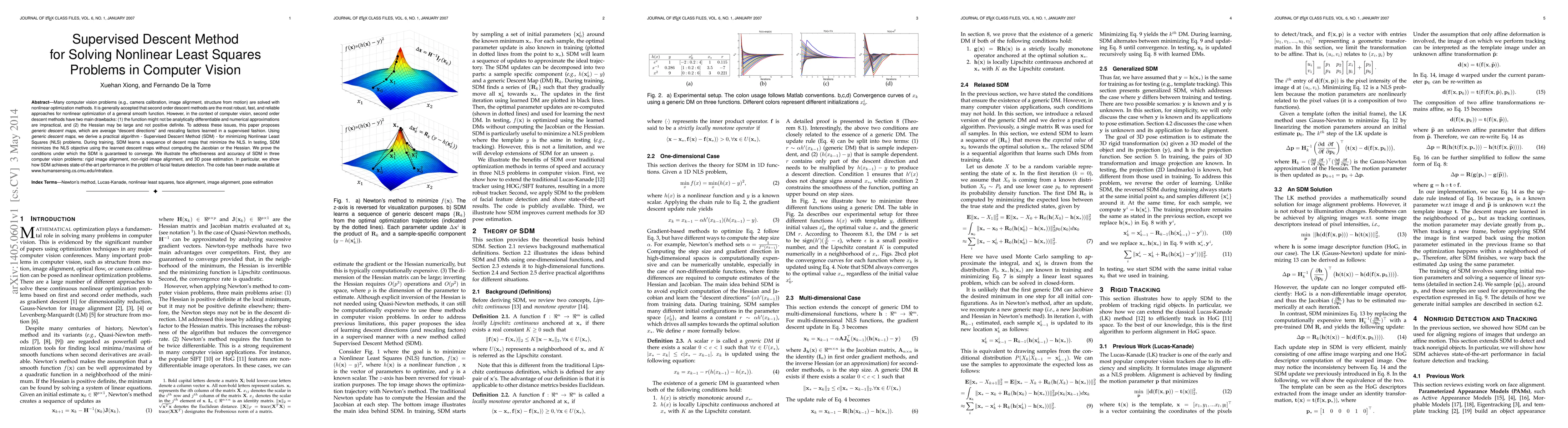 This paper introduces the Supervised Descent Method (SDM) to tackle nonlinear least squares problems in computer vision. SDM learns 'descent maps' in a supervised manner, avoiding computation of Jacobians or Hessians, and guarantees convergence under certain conditions. It outperforms existing methods in tasks like image alignment and facial feature detection, with code available at www.humansensing.cs.cmu.edu/intraface.