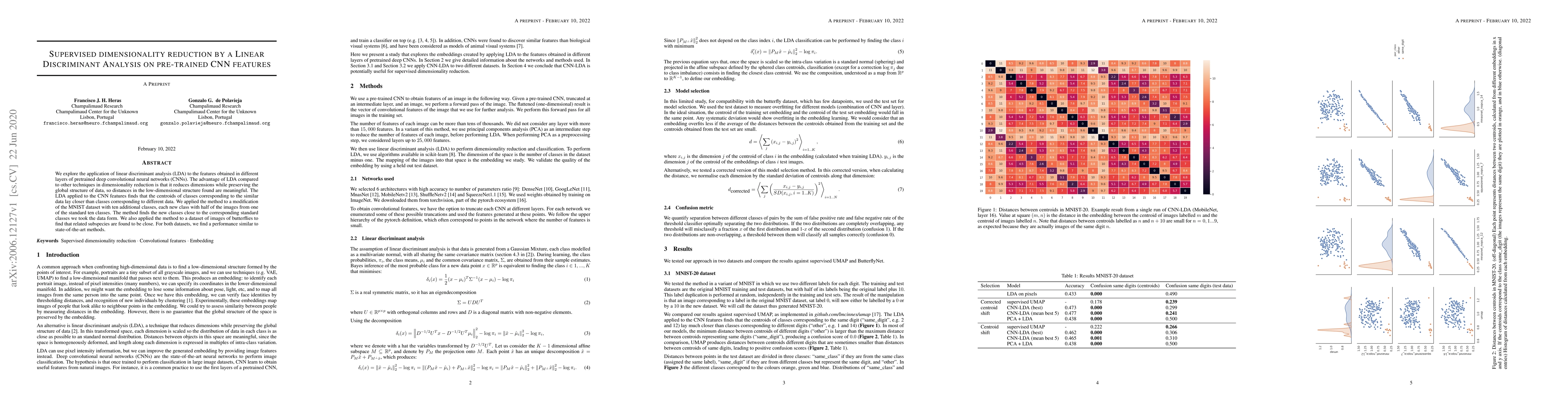 This paper applies linear discriminant analysis (LDA) to features from pretrained CNNs to achieve effective dimensionality reduction, preserving meaningful data distances. The method successfully identifies related classes and subspecies in modified MNIST and butterfly image datasets, showing performance comparable to state-of-the-art techniques.