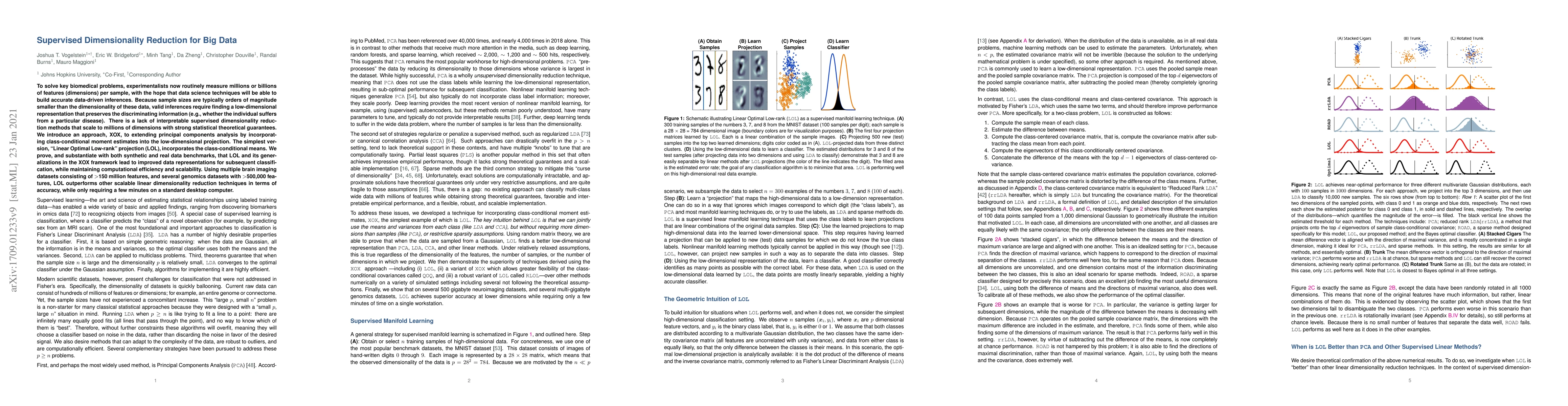 This paper introduces XOX, a supervised dimensionality reduction technique that extends principal components analysis by incorporating class-conditional moment estimates, achieving improved classification accuracy for big biomedical data. The proposed "Linear Optimal Low-rank" projection (LOL) method scales efficiently to millions of dimensions and outperforms other techniques in both accuracy and computational speed.