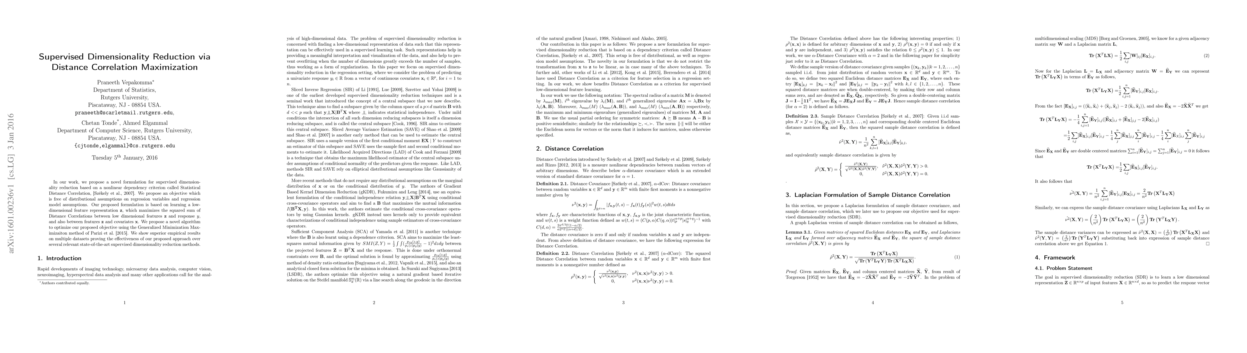 This paper introduces a supervised dimensionality reduction technique based on maximizing Statistical Distance Correlation to find a low-dimensional feature representation that retains essential dependencies with response variables and covariates. The proposed method is shown to outperform existing techniques on various datasets.