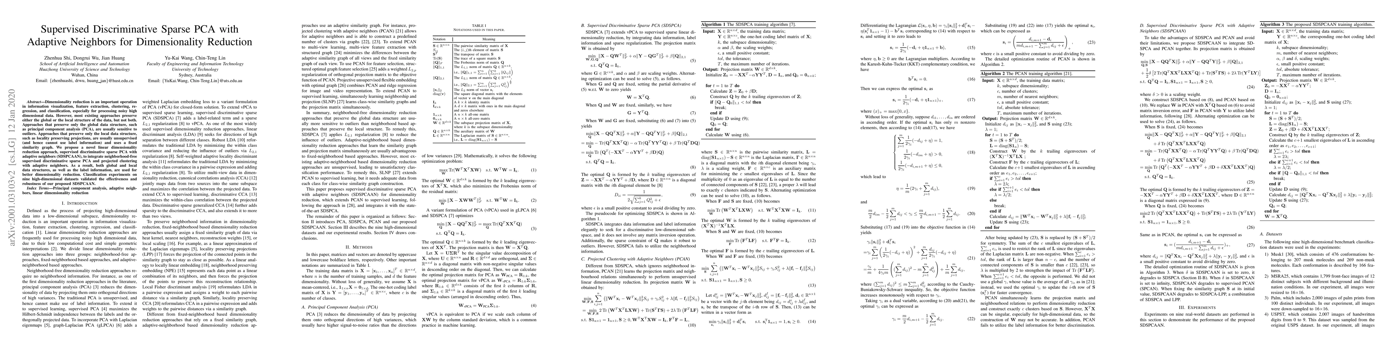 This paper introduces a novel supervised dimensionality reduction method called SDSPCAAN that combines supervised discriminative sparse PCA with adaptive neighbors to preserve both global and local data structures while utilizing label information. Experiments on nine high-dimensional datasets demonstrate its effectiveness and robustness.
