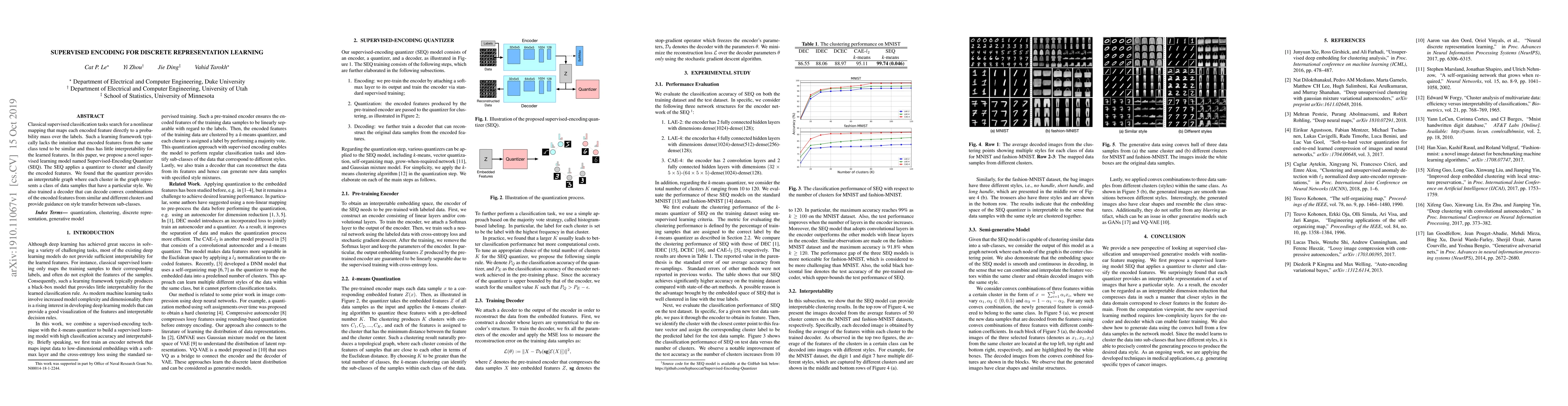 Classical supervised classification tasks search for a nonlinear mapping that maps each encoded feature directly to a probability mass over the labels. Such a learning framework typically lacks the intuition that encoded features from the same class tend to be similar and thus has little interpretability for the learned features. In this paper, we propose a novel supervised learning model named Supervised-Encoding Quantizer (SEQ). The SEQ applies a quantizer to cluster and classify the encoded features. We found that the quantizer provides an interpretable graph where each cluster in the graph represents a class of data samples that have a particular style. We also trained a decoder that can decode convex combinations of the encoded features from similar and different clusters and provide guidance on style transfer between sub-classes.