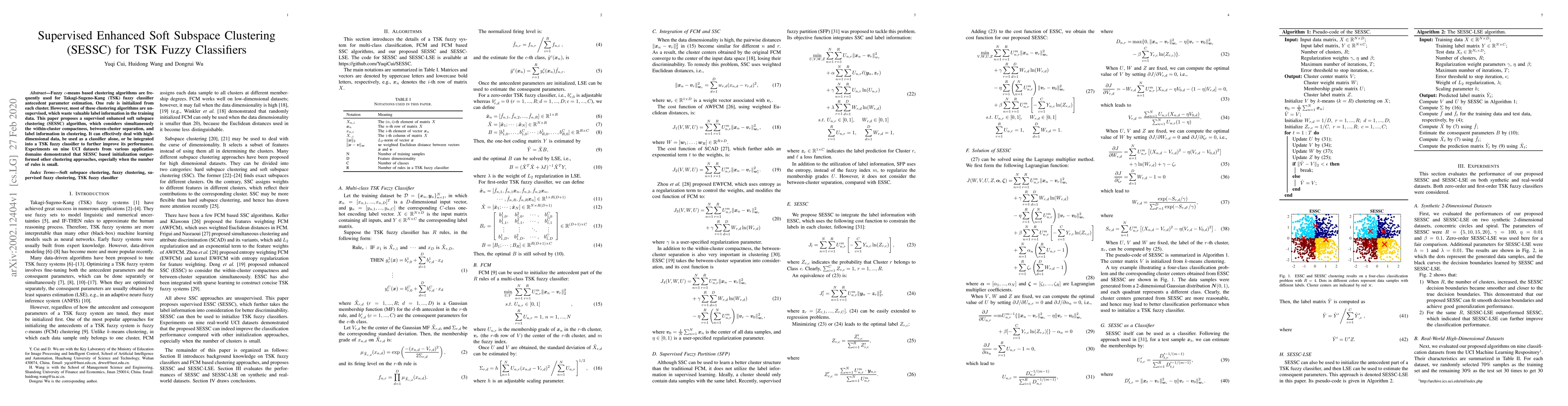 This paper proposes a supervised enhanced soft subspace clustering (SESSC) algorithm to improve TSK fuzzy classifier performance by utilizing both label information and data structure. SESSC outperforms unsupervised clustering methods on nine UCI datasets, especially when the number of rules is limited.