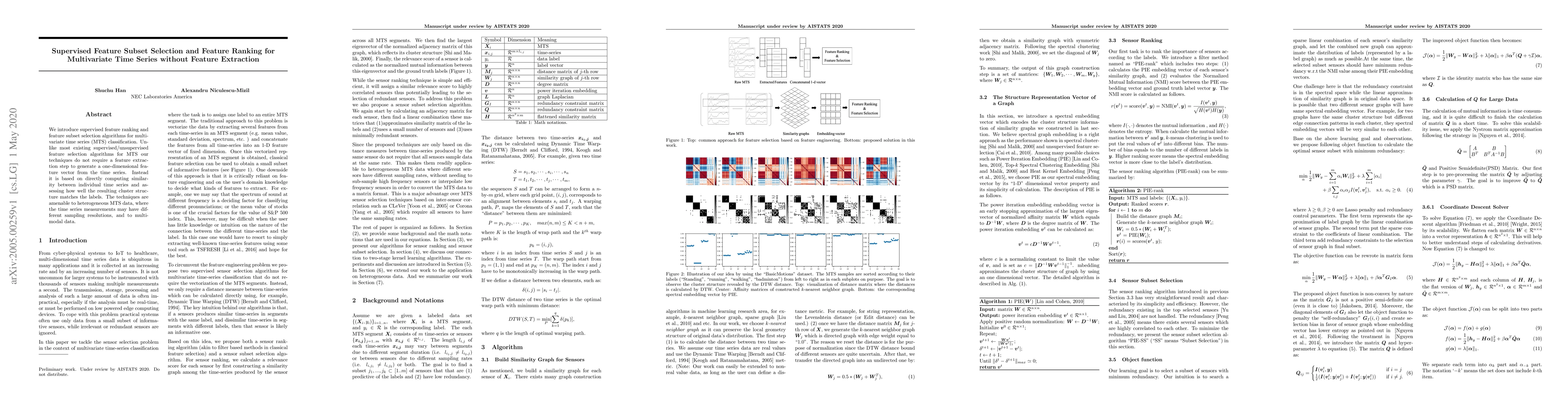 This paper proposes supervised algorithms for feature ranking and subset selection in multivariate time series classification, which directly compute similarity between time series without requiring a feature extraction step, making them suitable for heterogeneous and multi-modal data.