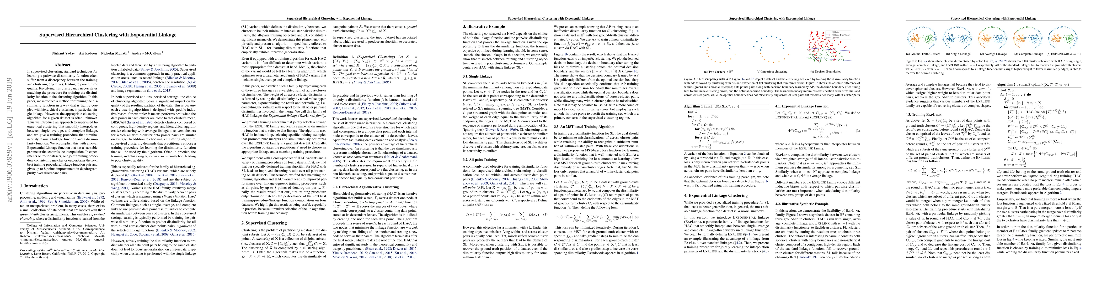This paper proposes a supervised hierarchical clustering method that trains a dissimilarity function in tandem with a novel Exponential Linkage function, which interpolates between single, average, and complete linkage. The approach consistently outperforms other methods in experiments, improving dendrogram purity by up to 8 points.