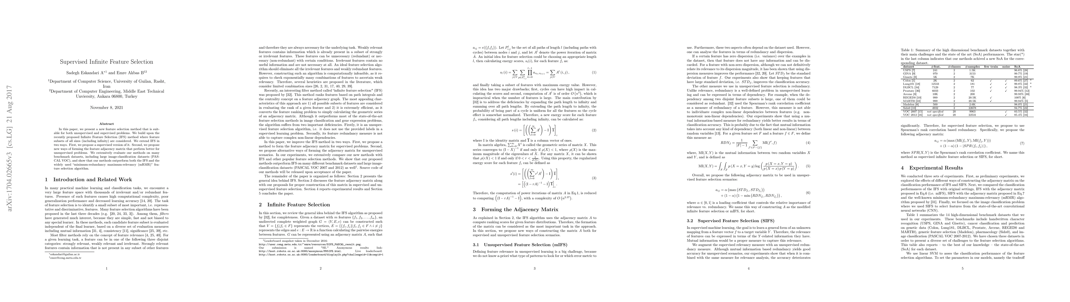 This paper introduces a supervised extension of the Infinite Feature Selection (IFS) method, enhancing it to better handle both supervised and unsupervised problems, and proposes improved feature adjacency matrix formulations. Experimental results on various datasets demonstrate superior performance compared to IFS and the mRMR algorithm.