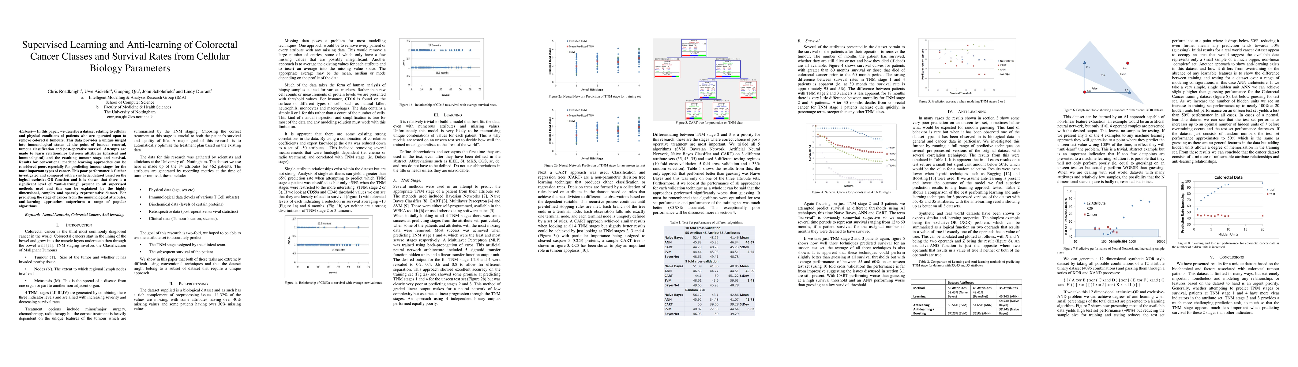 In this paper, we describe a dataset relating to cellular and physical conditions of patients who are operated upon to remove colorectal tumours. This data provides a unique insight into immunological status at the point of tumour removal, tumour classification and post-operative survival. Attempts are made to learn relationships between attributes (physical and immunological) and the resulting tumour stage and survival. Results for conventional machine learning approaches can be considered poor, especially for predicting tumour stages for the most important types of cancer. This poor performance is further investigated and compared with a synthetic, dataset based on the logical exclusive-OR function and it is shown that there is a significant level of 'anti-learning' present in all supervised methods used and this can be explained by the highly dimensional, complex and sparsely representative dataset. For predicting the stage of cancer from the immunological attributes, anti-learning approaches outperform a range of popular algorithms.