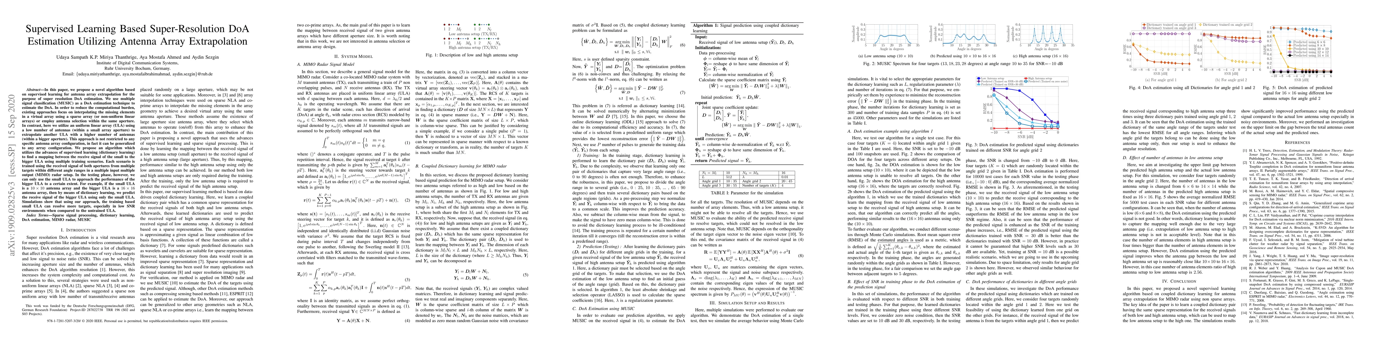 This paper proposes a supervised learning algorithm that uses coupled dictionary learning to extrapolate signals from a reduced number of antenna elements, enabling accurate direction of arrival (DOA) estimation in MIMO radar systems. The method predicts the received signal from a large virtual array using only a fraction of the actual antennas, significantly enhancing the radar's resolution capabilities.