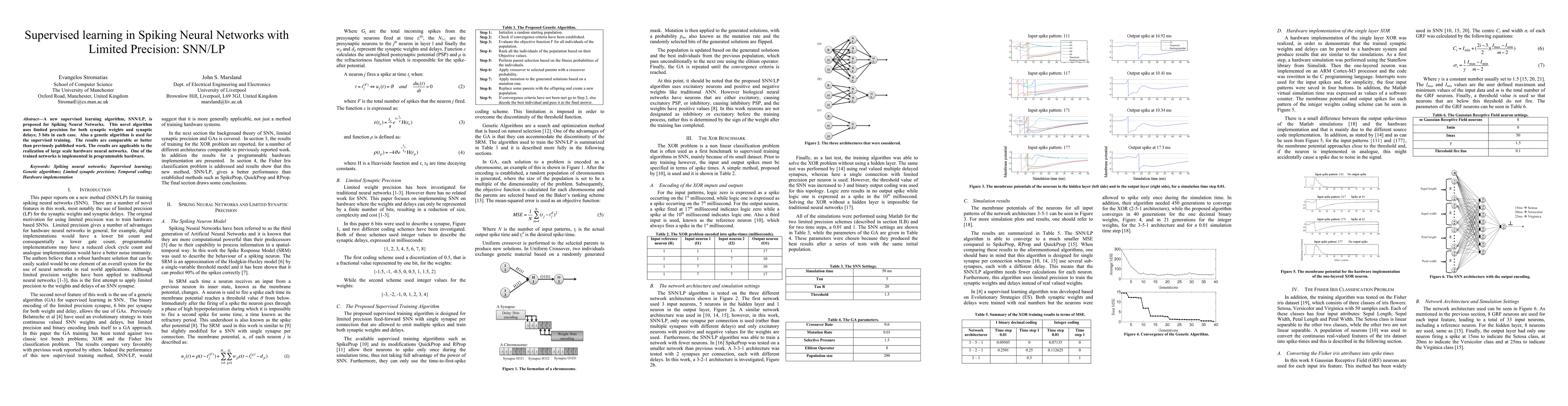 Summary: The paper introduces SNN/LP, a supervised learning algorithm for Spiking Neural Networks that uses limited precision (3 bits) for synaptic weights and delays, combined with a genetic algorithm for training. The results show comparable or superior performance to previous methods and are suitable for large-scale hardware implementations.
