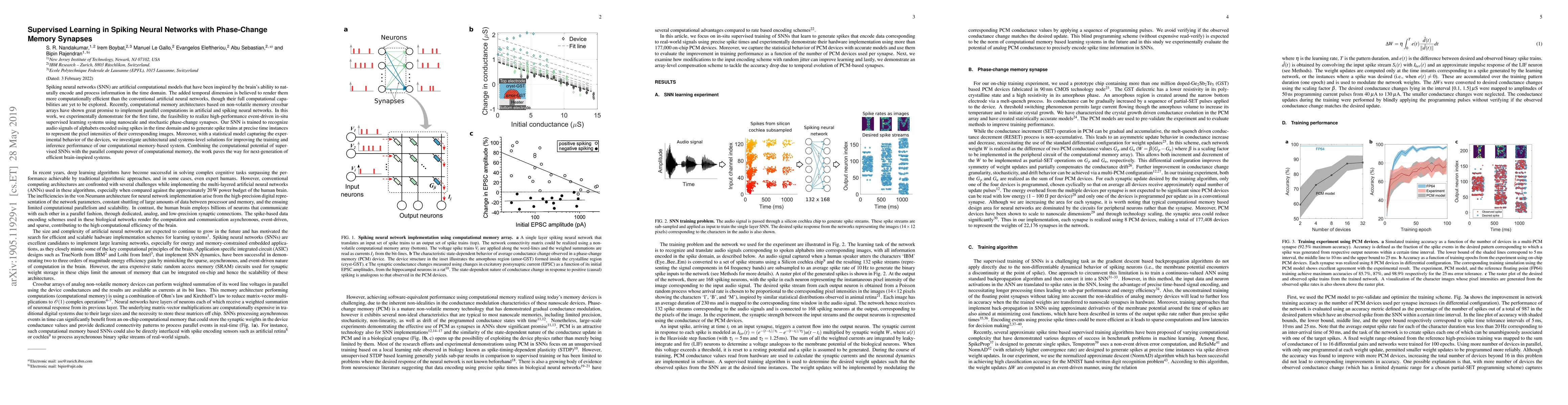 This research demonstrates the feasibility of high-performance supervised learning in spiking neural networks using phase-change memory synapses, achieving event-driven recognition of audio signals and precise image representation. The study also explores architectural improvements to enhance training and inference performance.