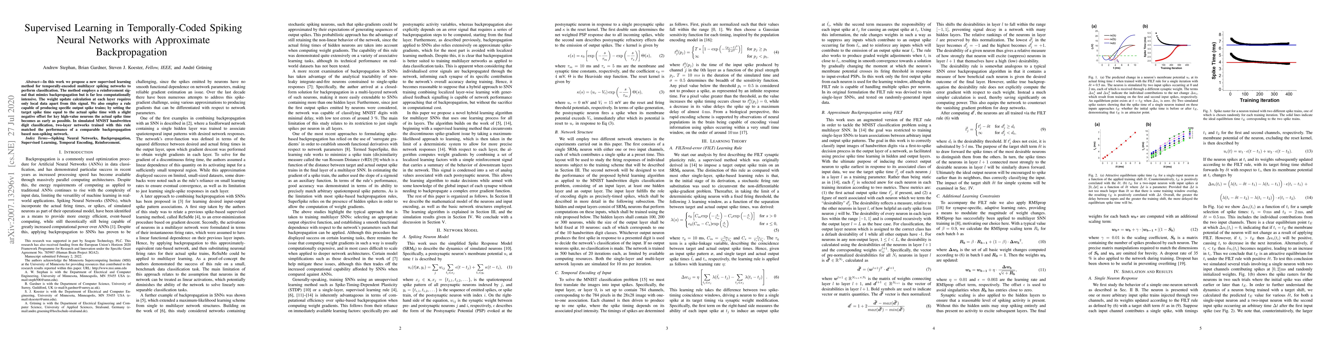 This paper introduces a supervised learning method for temporally-coded spiking neural networks using approximate backpropagation, achieving comparable performance to non-spiking networks in MNIST classification. The method relies on local data and a reinforcement signal to update weights, reducing computational intensity.