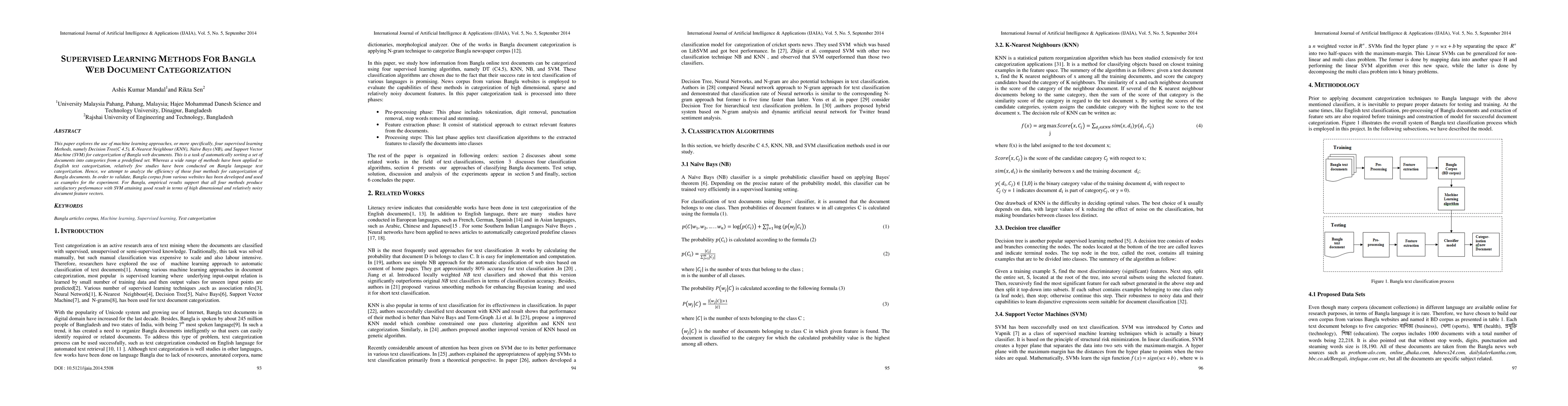 This paper investigates four supervised learning methods—Decision Tree (C 4.5), K-Nearest Neighbour (KNN), Naive Bayes (NB), and Support Vector Machine (SVM)—for categorizing Bangla web documents. The study finds that all methods perform satisfactorily, with SVM showing superior results for high-dimensional and noisy Bangla document feature vectors.