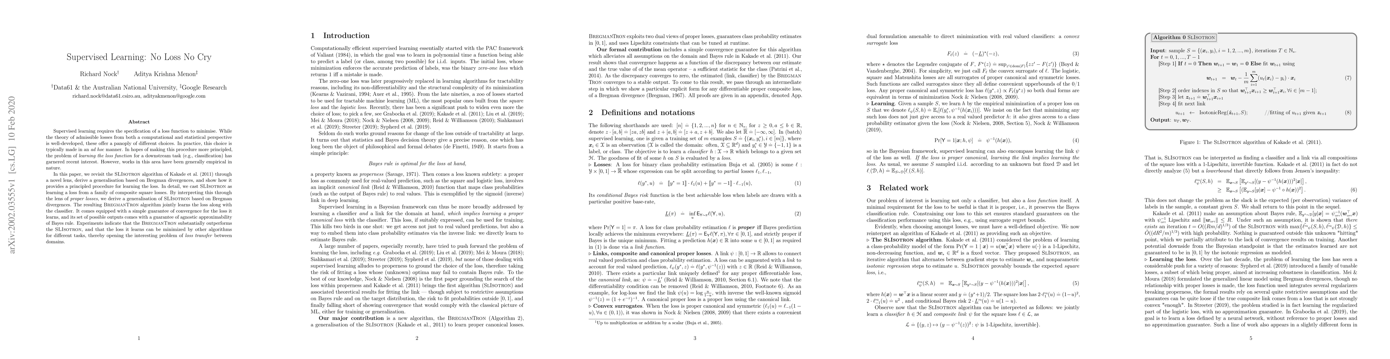 Supervised learning requires the specification of a loss function to minimise. While the theory of admissible losses from both a computational and statistical perspective is well-developed, these offer a panoply of different choices. In practice, this choice is typically made in an \emph{ad hoc} manner. In hopes of making this procedure more principled, the problem of \emph{learning the loss function} for a downstream task (e.g., classification) has garnered recent interest. However, works in this area have been generally empirical in nature. In this paper, we revisit the {\sc SLIsotron} algorithm of Kakade et al. (2011) through a novel lens, derive a generalisation based on Bregman divergences, and show how it provides a principled procedure for learning the loss. In detail, we cast {\sc SLIsotron} as learning a loss from a family of composite square losses. By interpreting this through the lens of \emph{proper losses}, we derive a generalisation of {\sc SLIsotron} based on Bregman divergences. The resulting {\sc BregmanTron} algorithm jointly learns the loss along with the classifier. It comes equipped with a simple guarantee of convergence for the loss it learns, and its set of possible outputs comes with a guarantee of agnostic approximability of Bayes rule. Experiments indicate that the {\sc BregmanTron} substantially outperforms the {\sc SLIsotron}, and that the loss it learns can be minimized by other algorithms for different tasks, thereby opening the interesting problem of \textit{loss transfer} between domains.