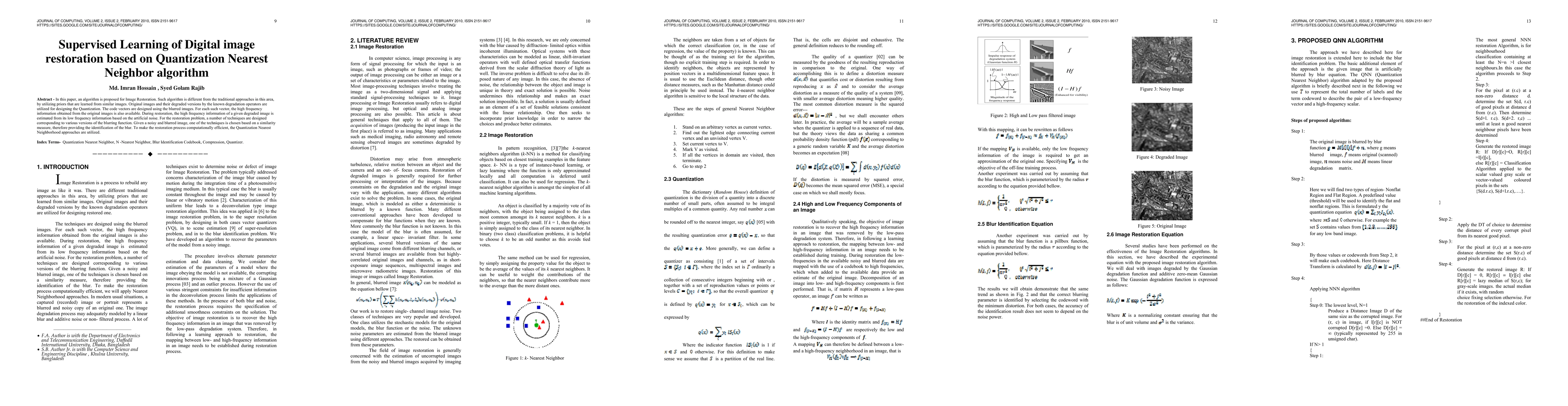 In this paper, an algorithm is proposed for Image Restoration. Such algorithm is different from the traditional approaches in this area, by utilizing priors that are learned from similar images. Original images and their degraded versions by the known degradation operators are utilized for designing the Quantization. The code vectors are designed using the blurred images. For each such vector, the high frequency information obtained from the original images is also available. During restoration, the high frequency information of a given degraded image is estimated from its low frequency information based on the artificial noise. For the restoration problem, a number of techniques are designed corresponding to various versions of the blurring function. Given a noisy and blurred image, one of the techniques is chosen based on a similarity measure, therefore providing the identification of the blur. To make the restoration process computationally efficient, the Quantization Nearest Neighborhood approaches are utilized.