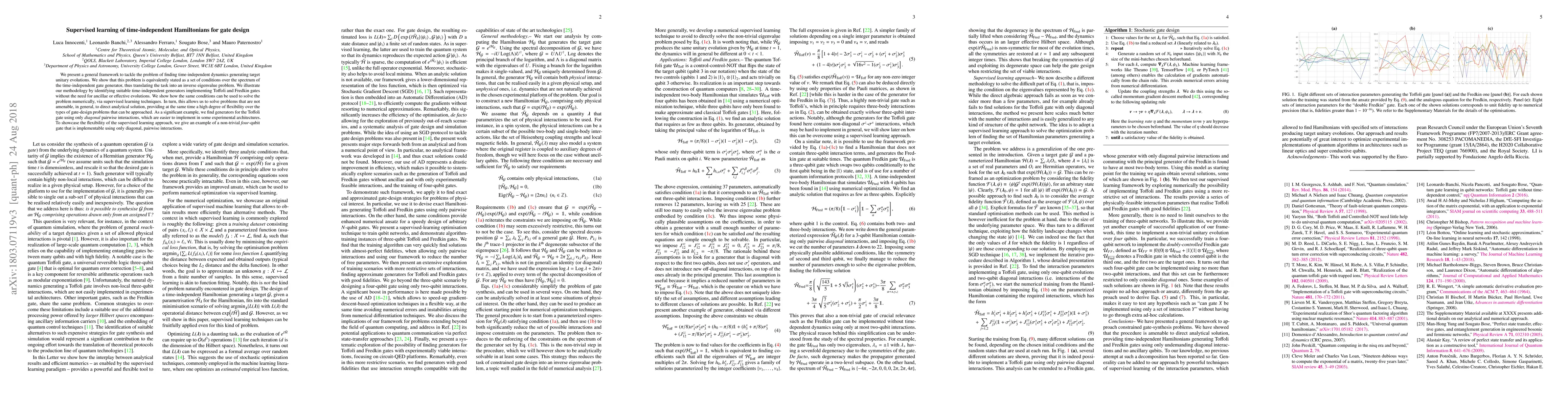 We present a general framework to tackle the problem of finding time-independent dynamics generating target unitary evolutions. We show that this problem is equivalently stated as a set of conditions over the spectrum of the time-independent gate generator, thus transforming the task to an inverse eigenvalue problem. We illustrate our methodology by identifying suitable time-independent generators implementing Toffoli and Fredkin gates without the need for ancillae or effective evolutions. We show how the same conditions can be used to solve the problem numerically, via supervised learning techniques. In turn, this allows us to solve problems that are not amenable, in general, to direct analytical solution, providing at the same time a high degree of flexibility over the types of gate-design problems that can be approached. As a significant example, we find generators for the Toffoli gate using only diagonal pairwise interactions, which are easier to implement in some experimental architectures. To showcase the flexibility of the supervised learning approach, we give an example of a nontrivial four-qubit gate that is implementable using only diagonal, pairwise interactions.