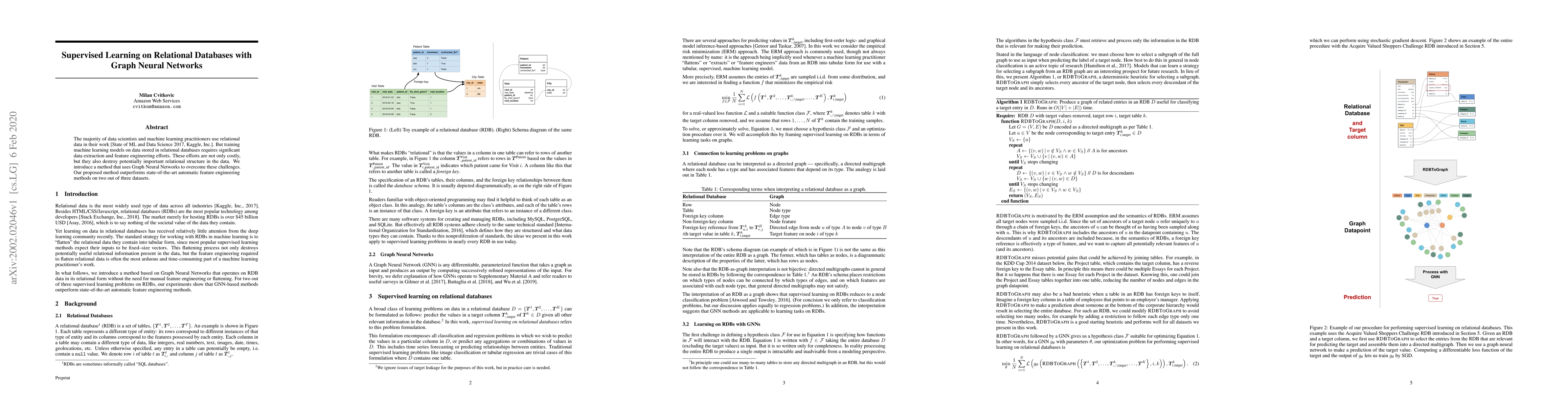 This paper proposes a method using Graph Neural Networks to directly train machine learning models on relational data stored in databases, reducing the need for costly data extraction and feature engineering while preserving relational structure. The method outperforms existing automatic feature engineering techniques on two out of three datasets.
