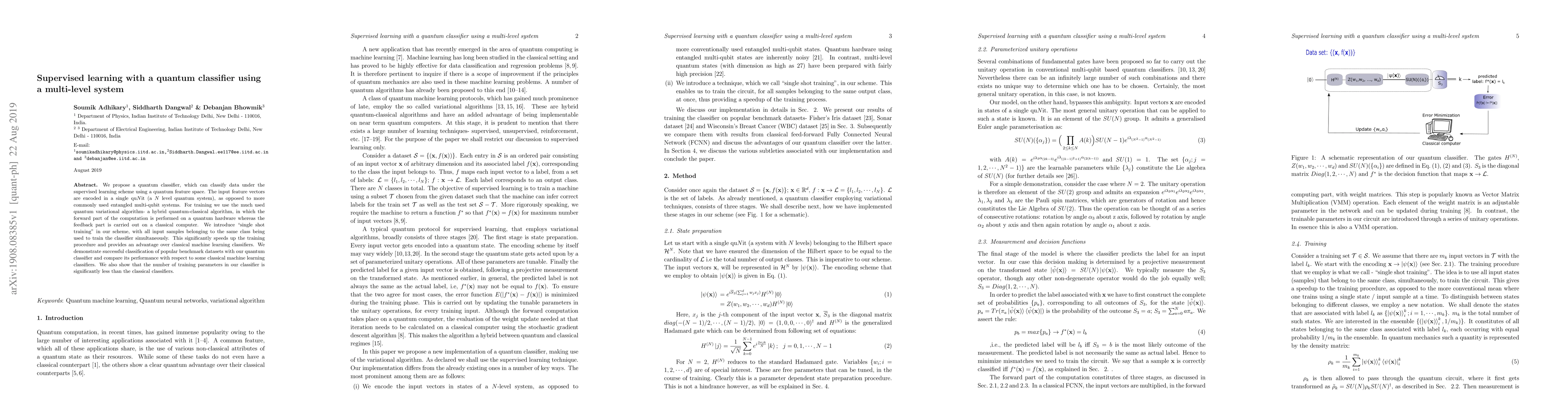 This paper proposes a quantum classifier utilizing a single multi-level quantum system (qu$N$it) for supervised learning, employing a hybrid quantum-classical training method. The approach uses "single shot training" to speed up the process and demonstrates competitive performance on benchmark datasets with fewer training parameters compared to classical classifiers.