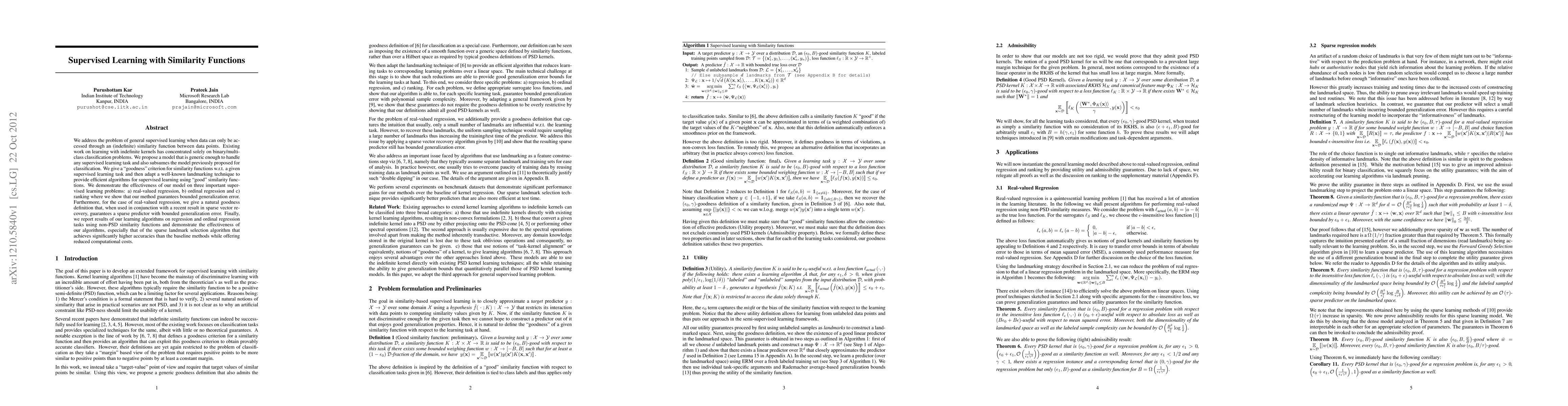 We address the problem of general supervised learning when data can only be accessed through an (indefinite) similarity function between data points. Existing work on learning with indefinite kernels has concentrated solely on binary/multi-class classification problems. We propose a model that is generic enough to handle any supervised learning task and also subsumes the model previously proposed for classification. We give a "goodness" criterion for similarity functions w.r.t. a given supervised learning task and then adapt a well-known landmarking technique to provide efficient algorithms for supervised learning using "good" similarity functions. We demonstrate the effectiveness of our model on three important super-vised learning problems: a) real-valued regression, b) ordinal regression and c) ranking where we show that our method guarantees bounded generalization error. Furthermore, for the case of real-valued regression, we give a natural goodness definition that, when used in conjunction with a recent result in sparse vector recovery, guarantees a sparse predictor with bounded generalization error. Finally, we report results of our learning algorithms on regression and ordinal regression tasks using non-PSD similarity functions and demonstrate the effectiveness of our algorithms, especially that of the sparse landmark selection algorithm that achieves significantly higher accuracies than the baseline methods while offering reduced computational costs.