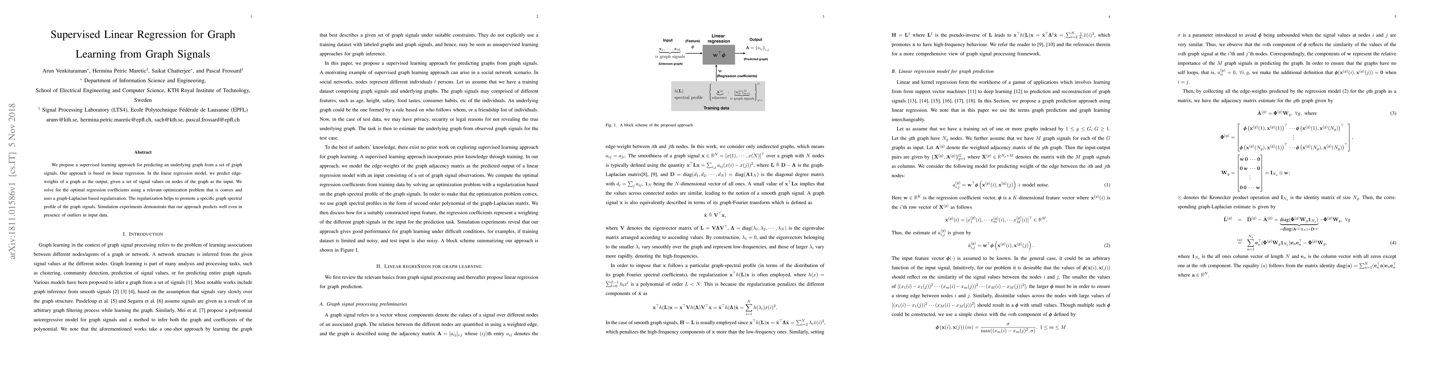We propose a supervised learning approach for predicting an underlying graph from a set of graph signals. Our approach is based on linear regression. In the linear regression model, we predict edge-weights of a graph as the output, given a set of signal values on nodes of the graph as the input. We solve for the optimal regression coefficients using a relevant optimization problem that is convex and uses a graph-Laplacian based regularization. The regularization helps to promote a specific graph spectral profile of the graph signals. Simulation experiments demonstrate that our approach predicts well even in presence of outliers in input data.
