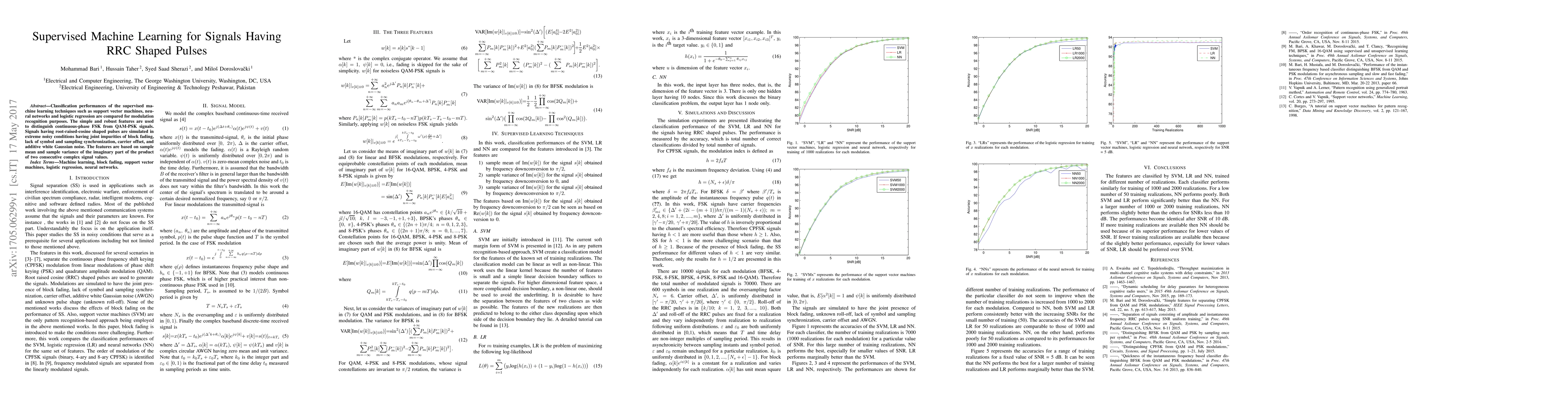 This paper compares machine learning techniques for recognizing signals with RRC pulses in noisy conditions, finding that simple features based on signal statistics can effectively distinguish between modulation types.