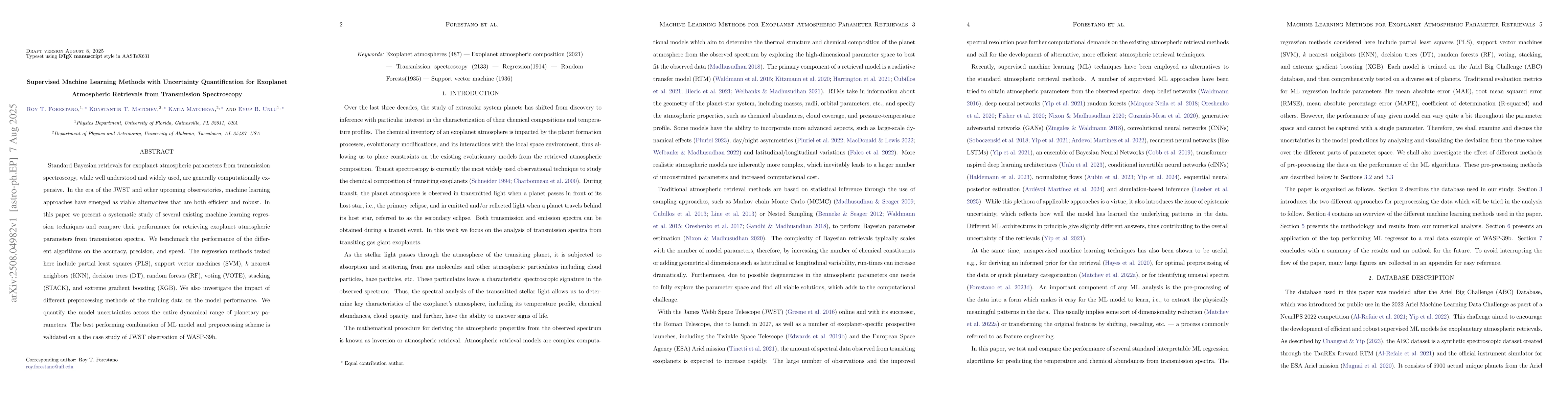 This research compares various machine learning regression techniques for retrieving exoplanet atmospheric parameters from transmission spectra, finding that methods like XGBoost perform well. The study also examines the impact of data preprocessing on model performance and quantifies uncertainties, validating the best combination on JWST's WASP-39b observation.