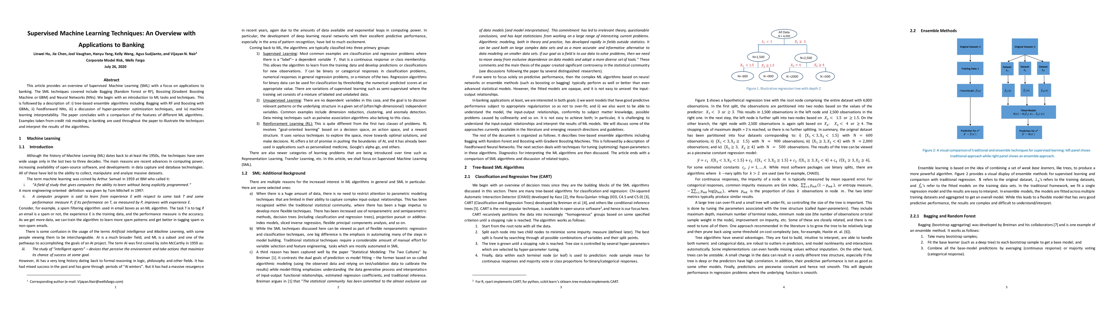 This paper offers an overview of Supervised Machine Learning techniques, focusing on applications in banking, including Bagging (Random Forest), Boosting (Gradient Boosting Machines), and Neural Networks. It discusses tree-based ensemble methods, feedforward neural networks, hyperparameter optimization, and machine learning interpretability, using banking's credit risk modeling as a case study.